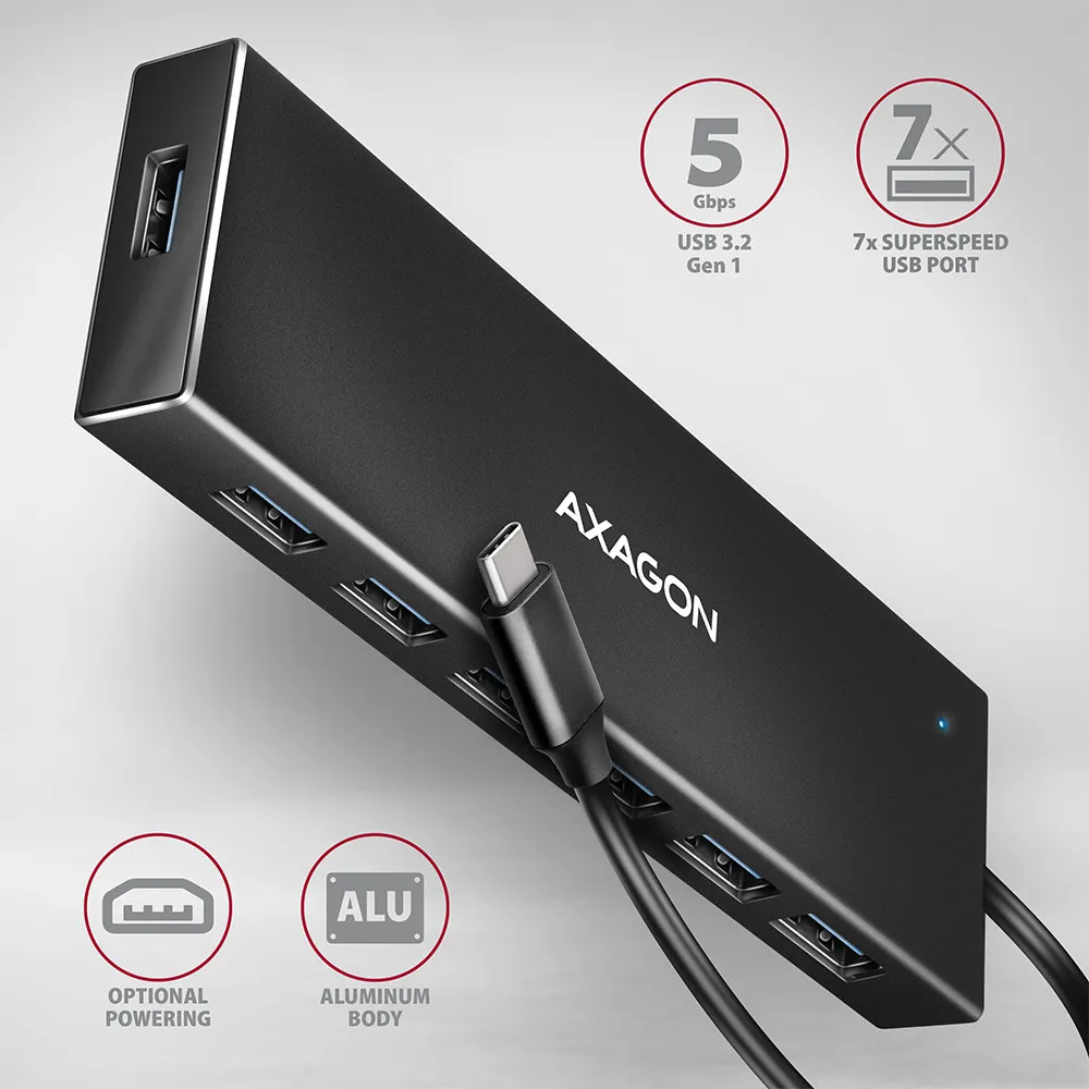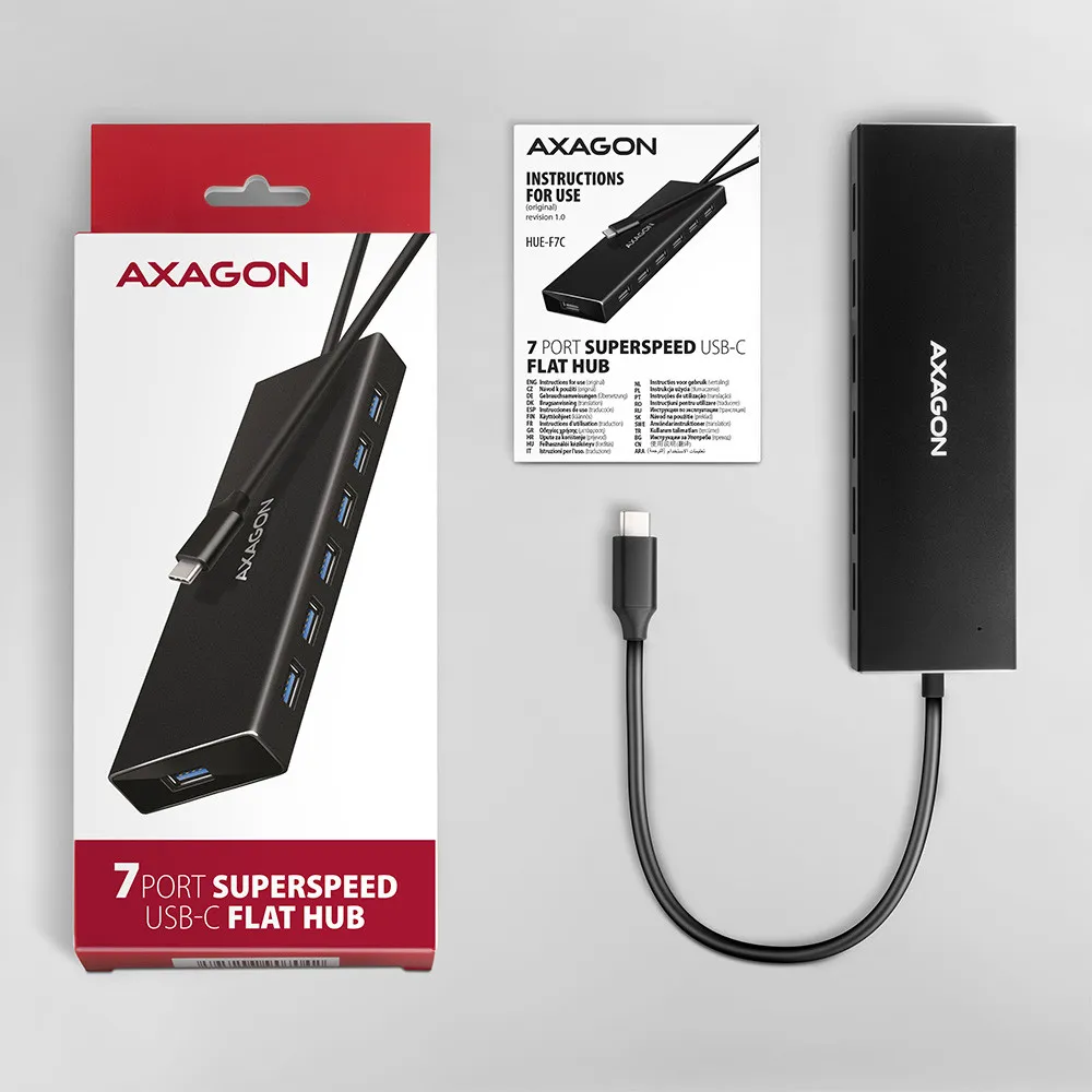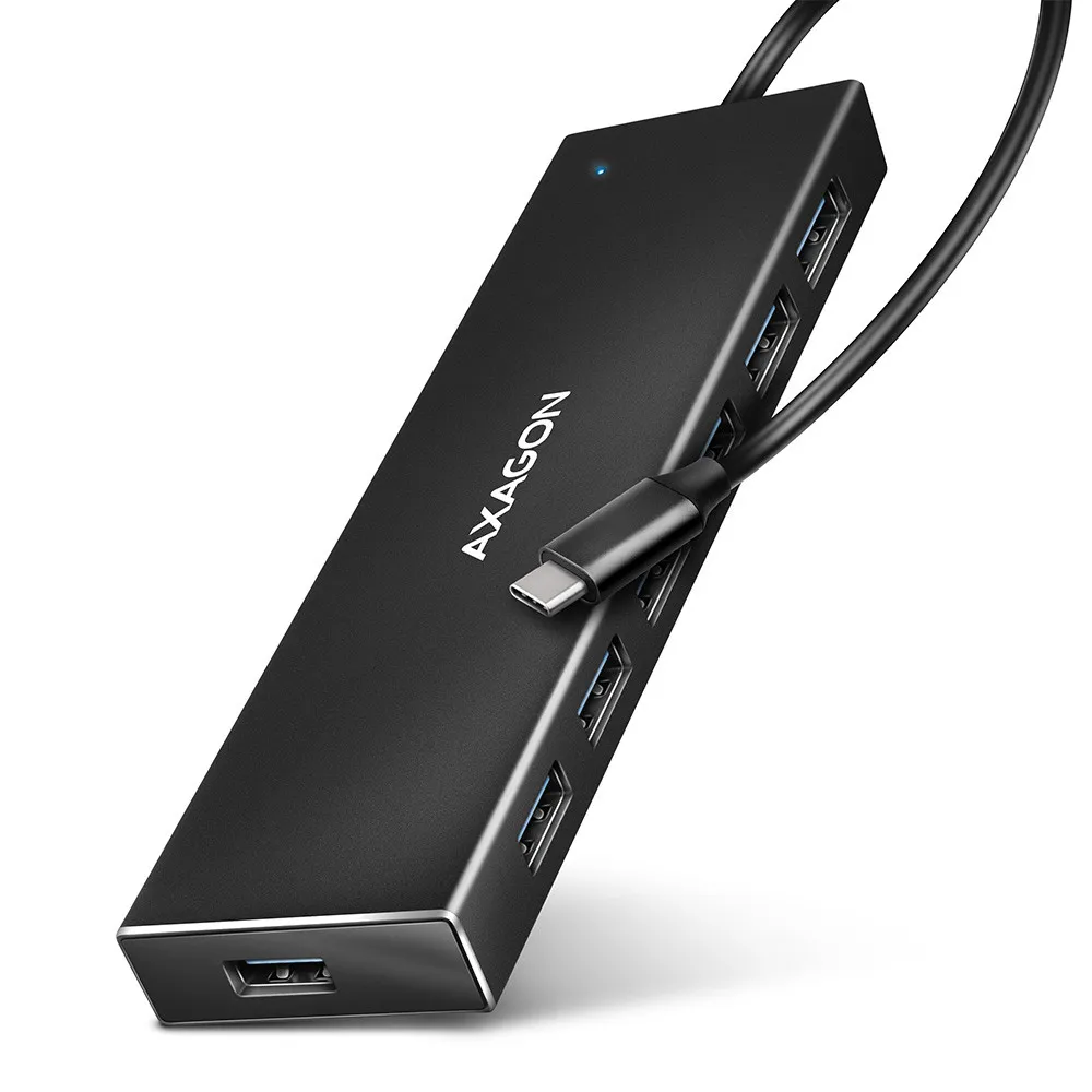 Thin USB-C 3.2 Gen 1 (USB 3.0) hub AXAGON HUE-F7C with 30 cm long USB cable fast and easy connects up to seven USB devices to the laptop at the same time. The USB 3.2 Gen 1 standard enables transfer speeds of up to 5 Gb/s.