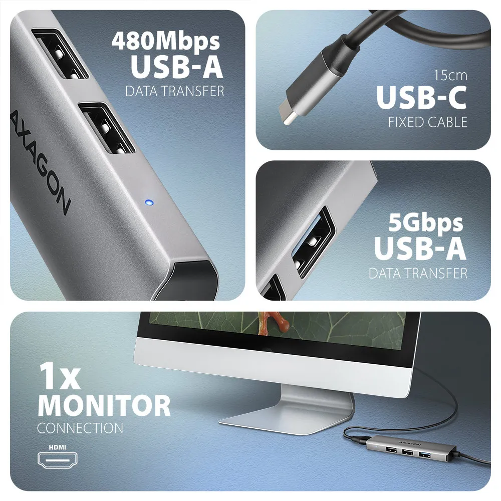 The multi-port USB-C 5Gbps AXAGON HMC-H3A STARTER 4in1 hub expands your laptop, computer or phone with four ports. Connect your laptop to the hub via a 15 cm long USB-C cable. You immediately have connectors to connect a monitor and three USB devices at the same time.