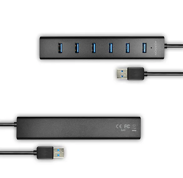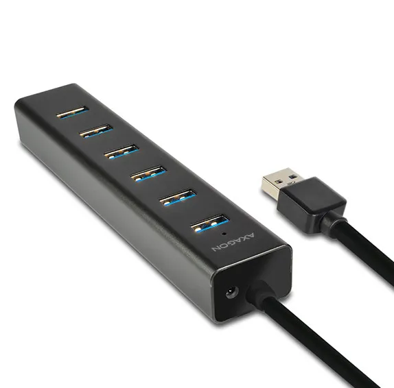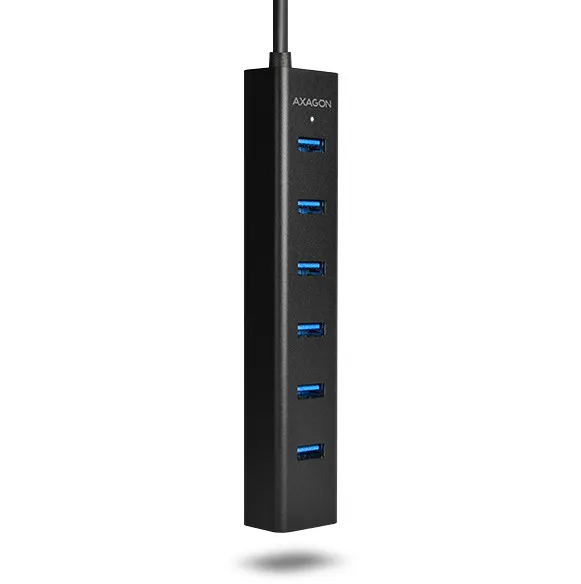 The seven-port AXAGON HUE-SA7BP ALU CHARGING USB 3.0 hub with own power and fast charging support on all USB ports.