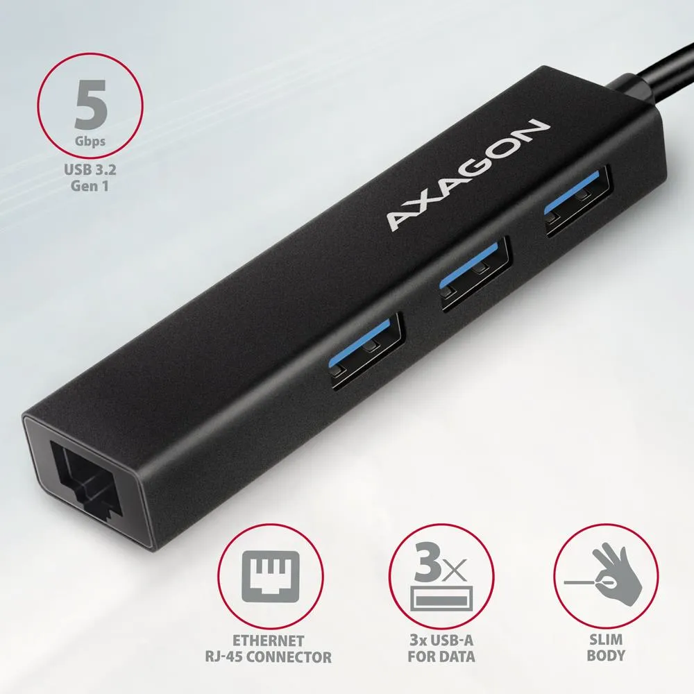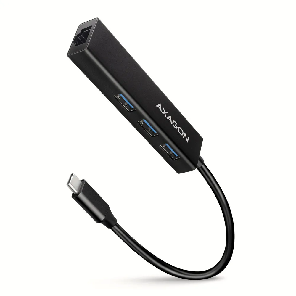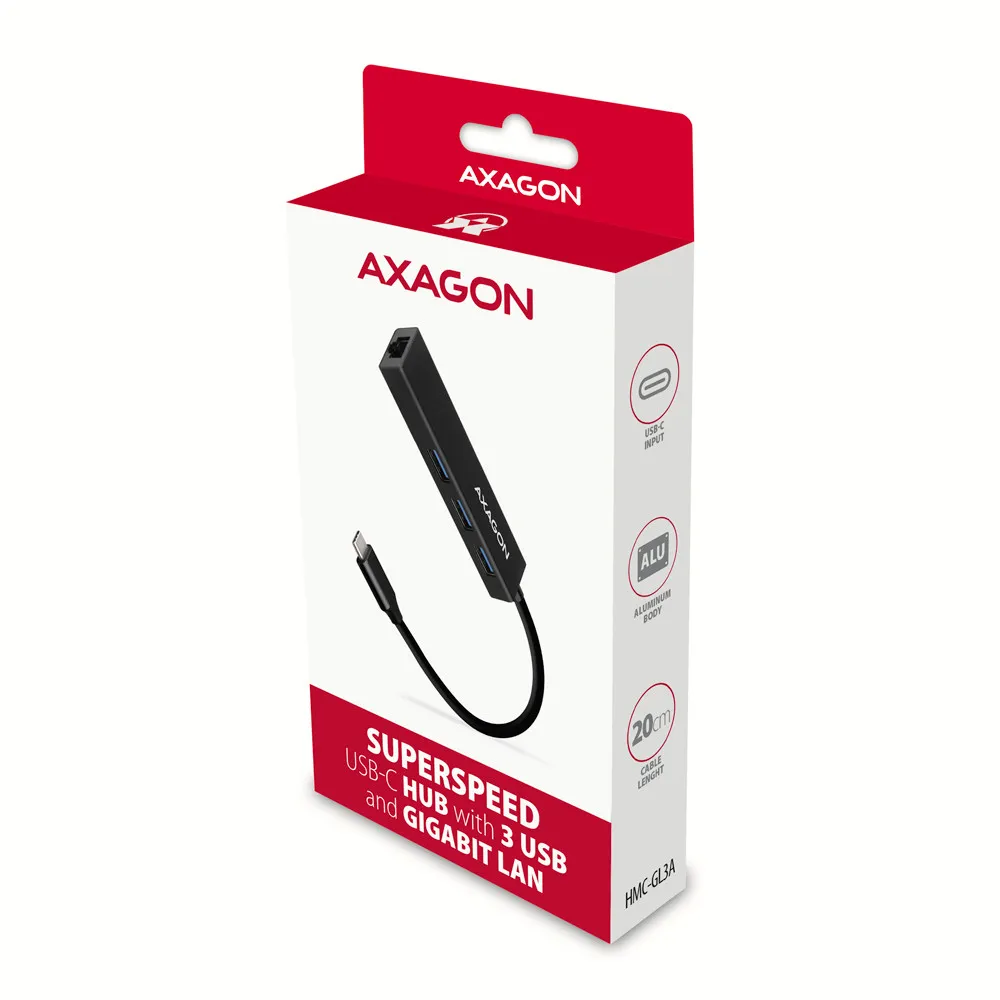Slim metal USB-C 3.2 Gen 1 (USB 3.0) multi-port hub AXAGON HMC-GL3A connects up to three USB devices to laptop or computer and also adds Gigabit network card which connects your computer to high speed network.