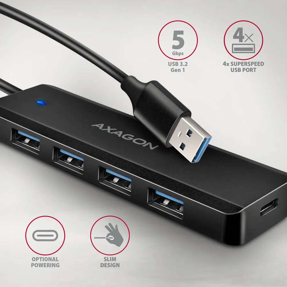 Travel USB-A 5Gbps hub AXAGON HUE-C1A fast and easy connects up to four USB devices to laptop or computer at the same time. Fixed 19 cm long USB-A cable is ideal for mobile devices users. The USB 3.2 Gen 1 standard enables transfer speeds of up to 5 Gb/s.