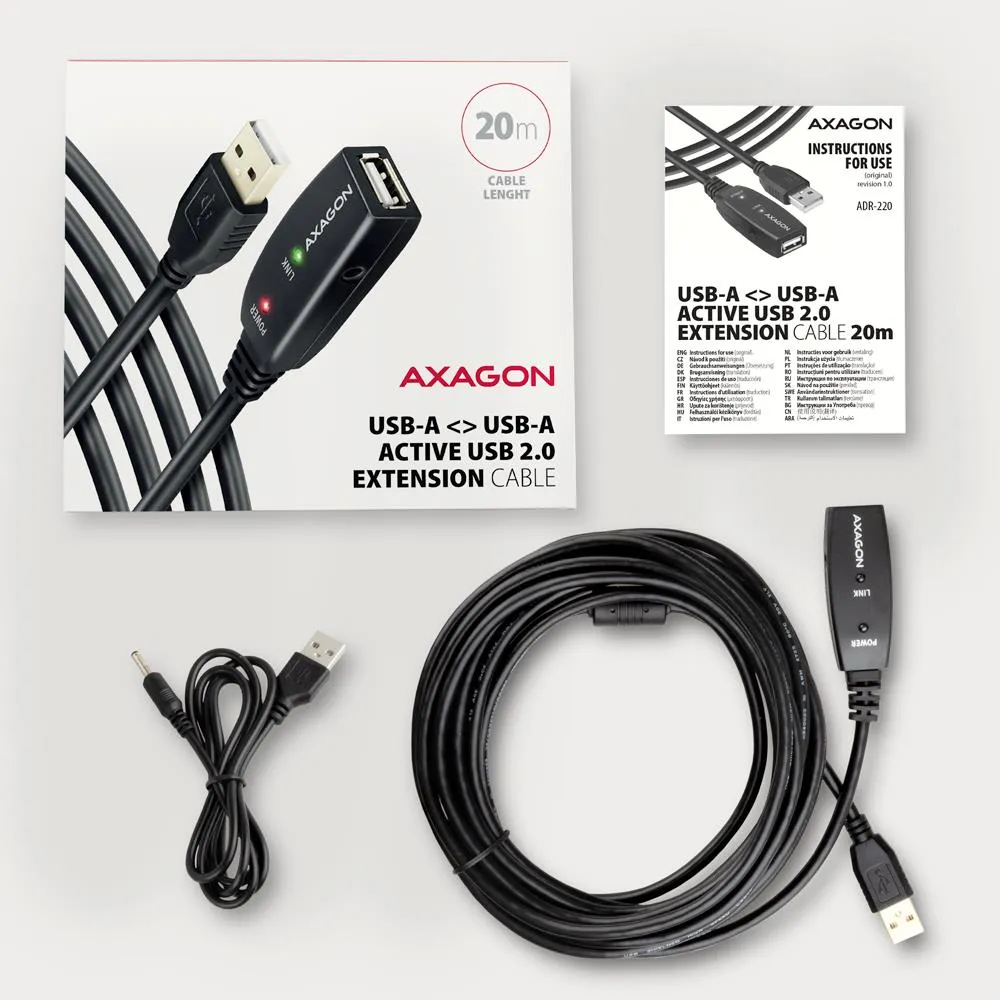 Active extension USB 2.0 A-M > A-F cable, 20 m long. Power supply option.