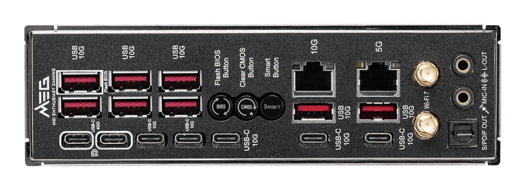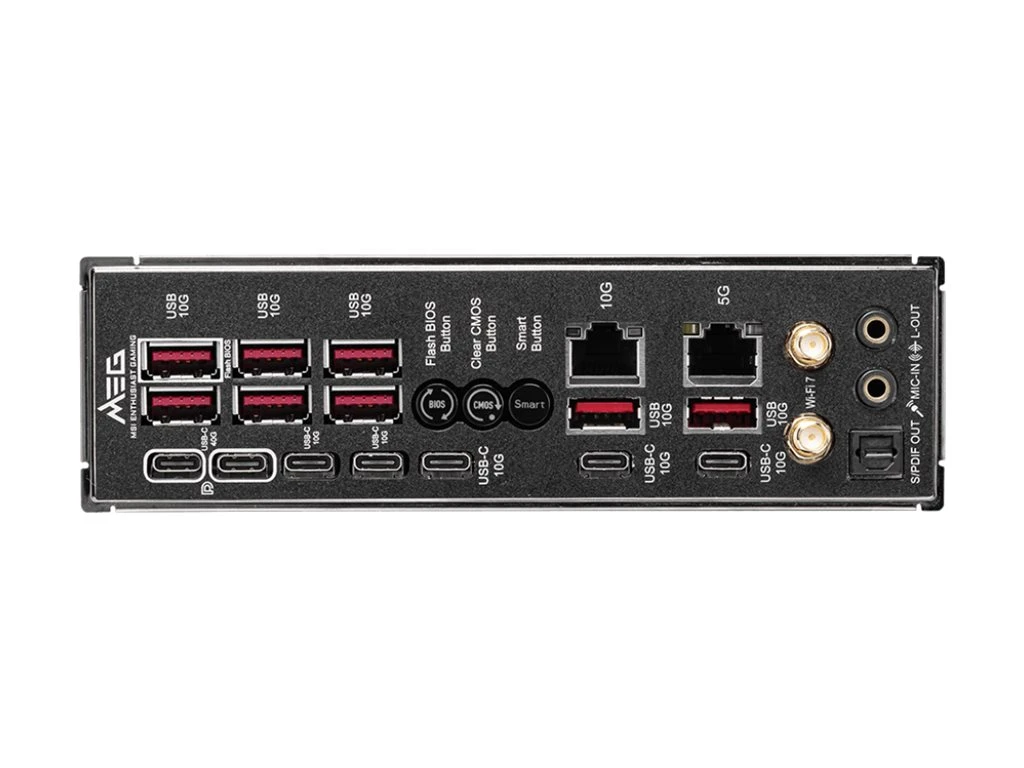 MSI MEG X870E GODLIKE. Protsessori tootja: AMD, Protsessori pesa: Protsessoripesa AM5, Ühilduvad protsessoriseeriad: AMD Ryzen 7000 Series, AMD Ryzen 8000 Series, AMD Ryzen 9000 Series. Toetatud mälutüübid: DDR5-SDRAM, Maksimaalne sisemälu: 256 GB, Mälupesa tüüp: DIMM. Kõvaketta ühenduse tüüp: M.2, SATA III, Toetatud ketaste tüübid: HDD & SSD, RAID-tasemed: 0, 1, 10. Ethernet-liidese tüüp: 5 Gigabit Ethernet, Wi-Fi standard: Wi-Fi 7 (802.11be), WiFi-standardid: 802.11a, 802.11b, 802.11g, Wi-Fi 4 (802.11n), Wi-Fi 5 (802.11ac), Wi-Fi 6 (802.11ax), Wi-Fi 6E.... Komponent: PC, Emaplaadi kujutegur: Laiendatud ATX, Emaplaadi kiibistik: AMD
