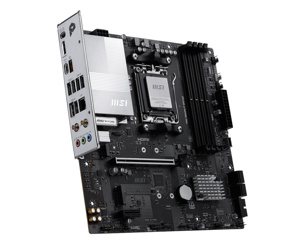 MSI PRO B840M-P WIFI6E. Protsessori tootja: AMD, Protsessori pesa: Protsessoripesa AM5, Ühilduvad protsessoriseeriad: AMD Ryzen 7000 Series, AMD Ryzen 8000 Series, AMD Ryzen 9000 Series. Toetatud mälutüübid: DDR5-SDRAM, Maksimaalne sisemälu: 256 GB, Mälupesa tüüp: DIMM. Kõvaketta ühenduse tüüp: M.2, Micro SATA III, Toetatud ketaste tüübid: HDD & SSD, RAID-tasemed: 0, 1, 10. Ethernet-liidese tüüp: 2.5 Gigabit Ethernet, LAN-kontroller: Realtek RTL8125D, Wi-Fi standard: Wi-Fi 6E (802.11ax). Komponent: PC, Emaplaadi kujutegur: Mikro ATX, Emaplaadi kiibistik: AMD
