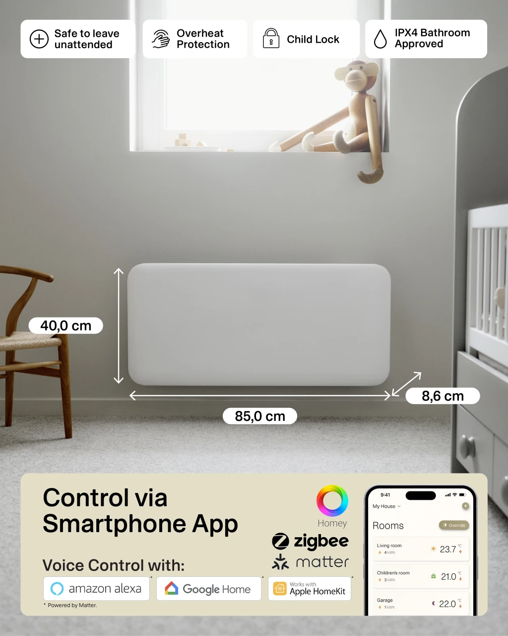 | Heating element material | X-aluminium – high efficiency, low surface temperature (max. 72 °C) |
