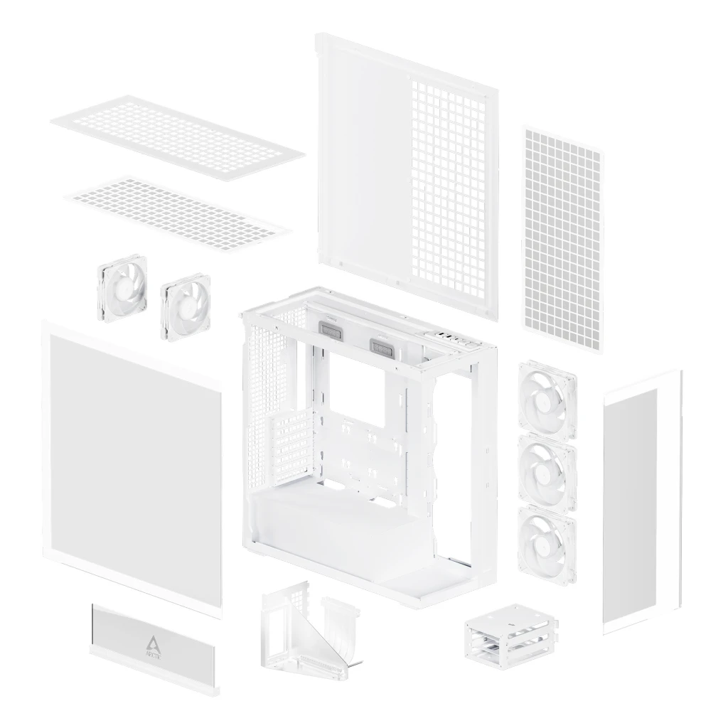 ARCTIC Xtender VG (White). Toote kuju: Midi Tower, Tüüp: PC, Toote värv: Valge. Toiteploki asukoht: Põhi, Toetatud elektritoite tarne vormi faktorid: ATX. Installitud küljeventilaatorid: 3x 140 mm, Toetatud küljeventilaatorite läbimõõt: 120,140 mm, Installitud tagaventilaatorid: 2x 120 mm. Toetatud kõvakettasuurused: 2.5,3.5". Laius: 231 mm, Sügavus: 529 mm, Kõrgus: 529 mm