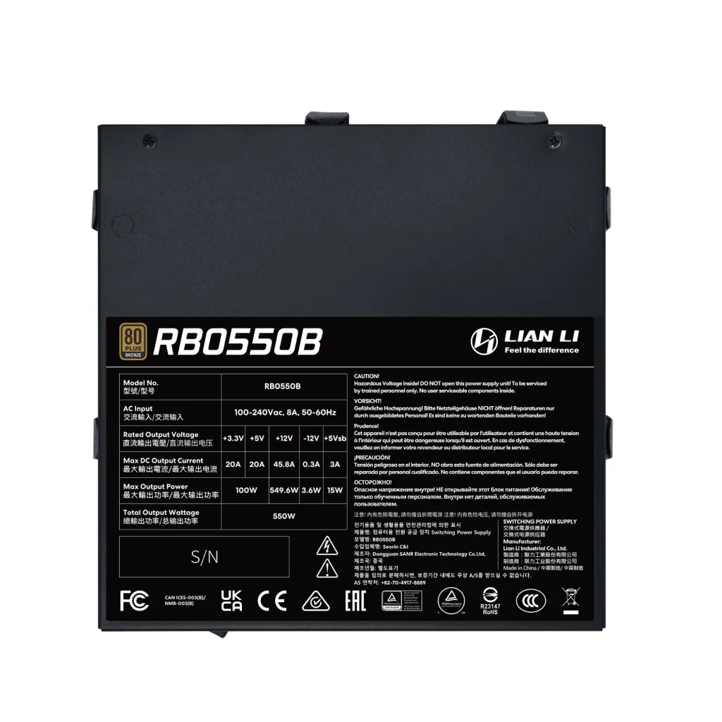 | Summary | Lian Li RB0550B.B. Total power: 550 W, AC input voltage: 100 - 240 V, AC input frequency: 50/60 Hz. Motherboard power connector: 24-pin ATX, Motherboard power cable length: 60 cm, CPU power cable length: 65 cm. Purpose: PC, Power supply unit (PSU) form factor: ATX, 80 PLUS certification: 80 PLUS Bronze. Product colour: Black, Fan diameter: 13.5 cm, Number of fans: 1 fan(s). Certification: CE/CB/cTUVus/TÜV/FCC/BSMI/CCC/KCC/SAA+RCM |