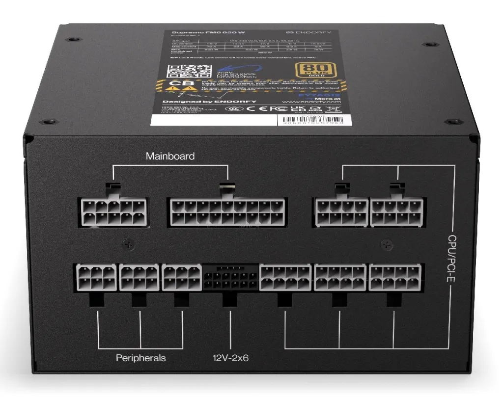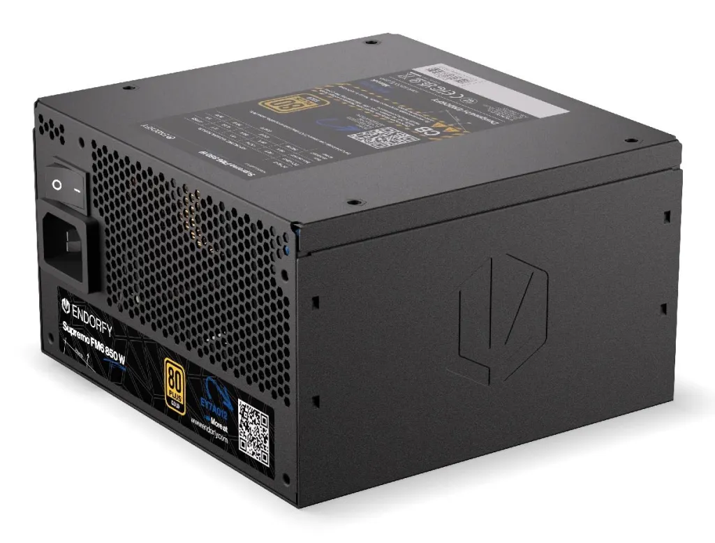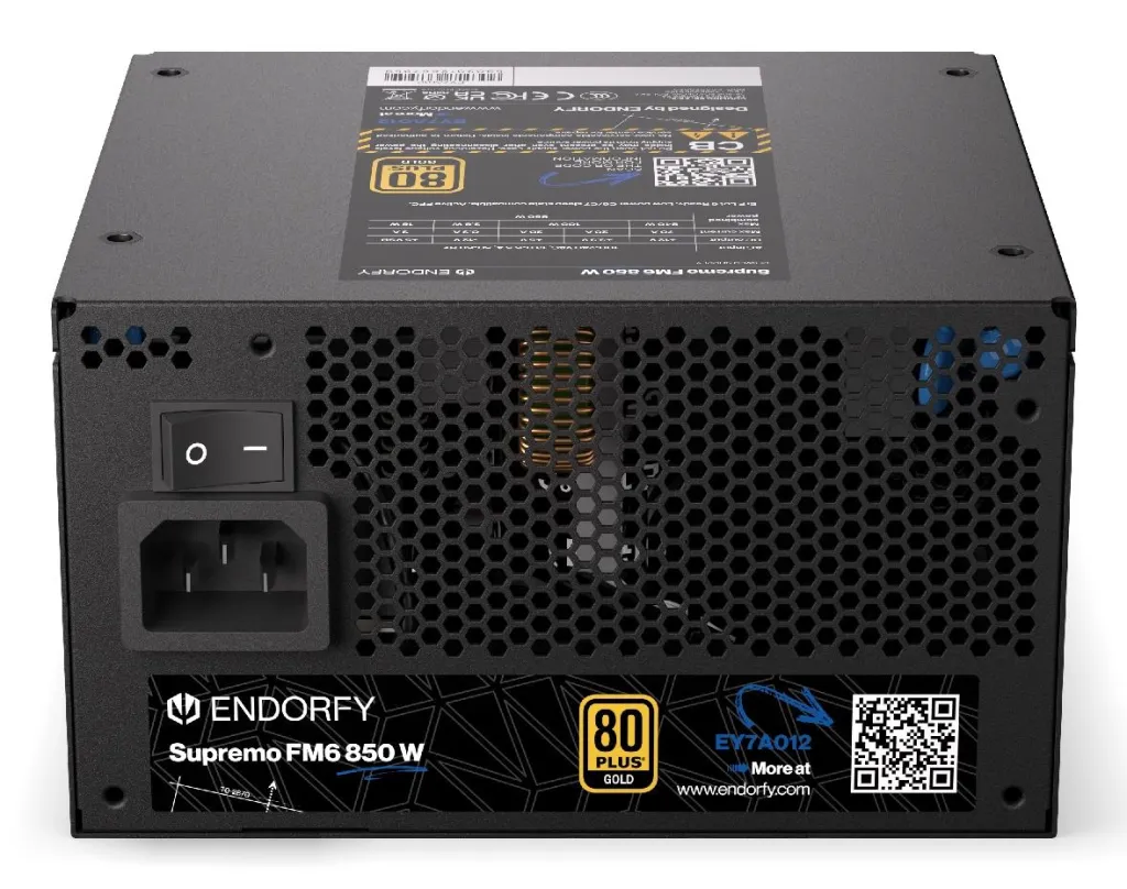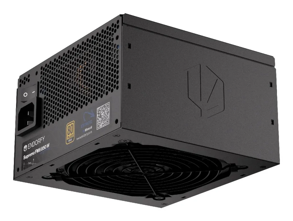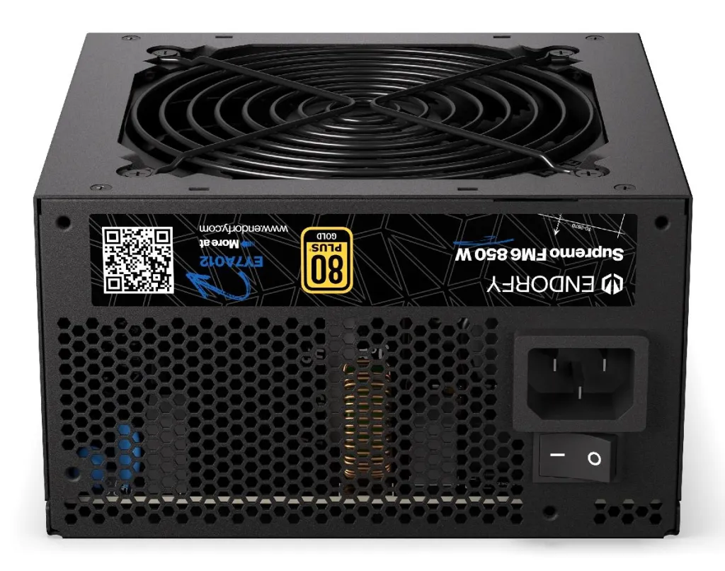 | Summary | ENDORFY Supremo FM6 850 W. Total power: 850 W, AC input voltage: 100 - 240 V, AC input frequency: 50/60 Hz. Motherboard power connector: 24-pin ATX, SATA power cable length: 560 mm, Cabling type: Fully-Modular. Purpose: PC, Power supply unit (PSU) form factor: ATX, 80 PLUS certification: 80 PLUS Gold. Product colour: Black, Cooling type: Active, Fan diameter: 12 cm. Cables included: AC |