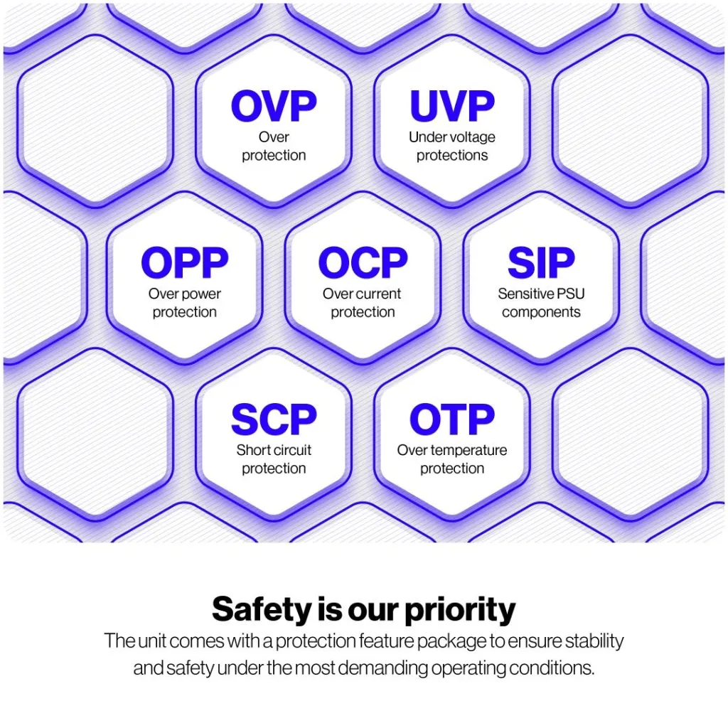 | Power protection features | Over current/Over power/Over voltage/Short circuit/Surge & inrush protection (SIP)/Under temperature/Under voltage |