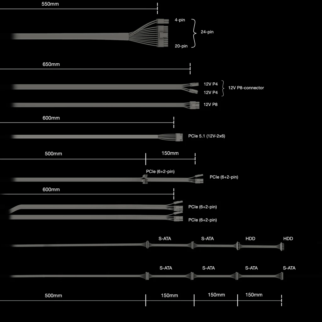 | Kaablid kaasa arvatud | Vahelduvvool, CPU, PCIe, Peripheral (Molex), SATA |
