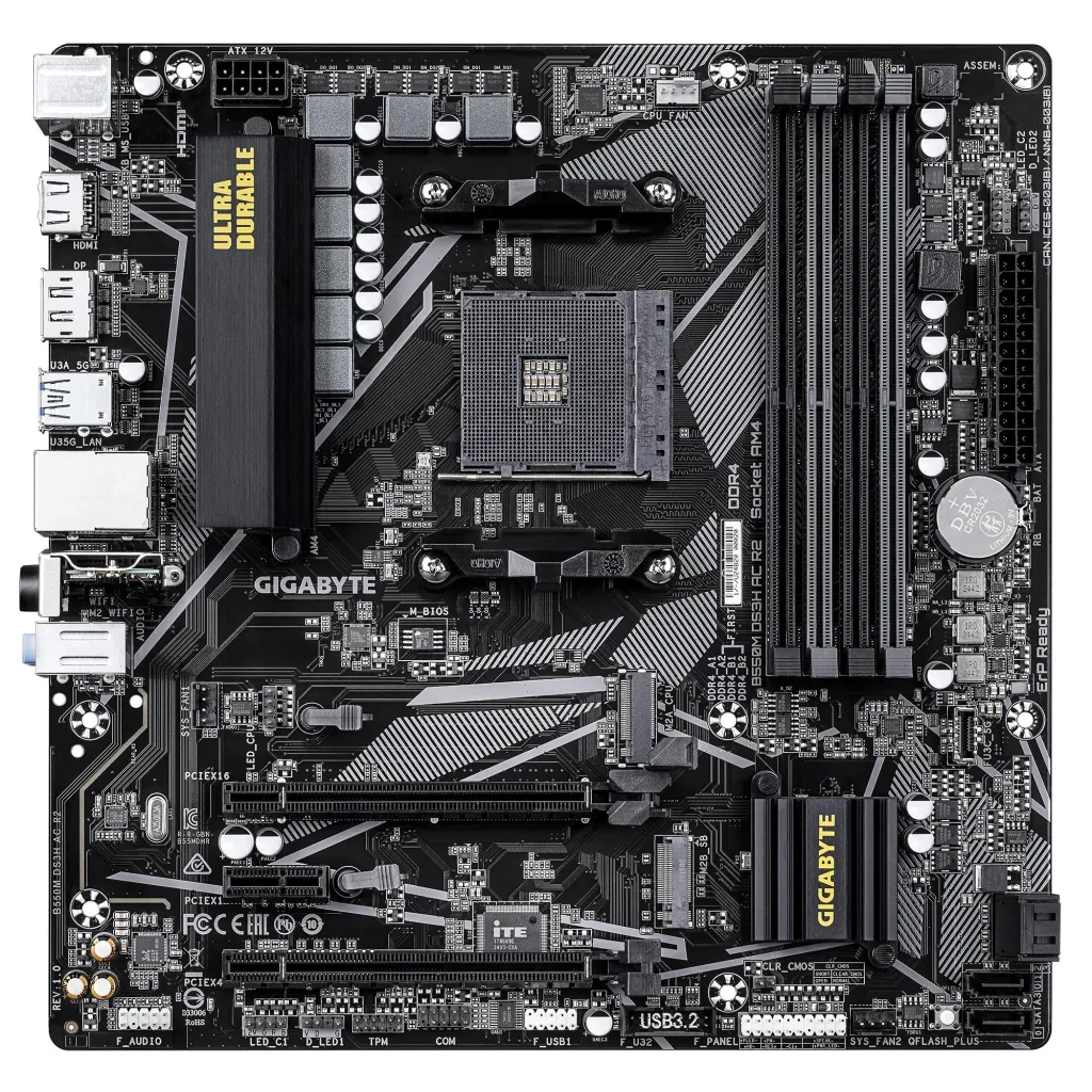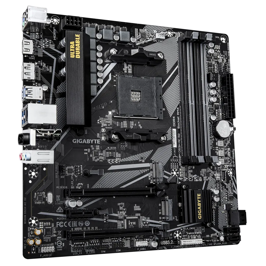 | Summary | GIGABYTE B550M DS3H AC R2 Motherboard - AMD Ryzen 5000 CPUs, 5+3 Phases VRM, up to 4733MHz DDR4 (O.C.), 1xPCIe 4.0 + 1xPCIe 3.0 M.2, Wi-Fi 5, 1GbE LAN, USB 3.2 Gen 1. Processor manufacturer: AMD, Processor socket: Socket AM4, Compatible processor series: AMD Ryzen 3000 Series, AMD Ryzen 4000 Series, AMD Ryzen 5000 Series. Supported memory types: DDR4-SDRAM, Maximum internal memory: 128 GB, Memory slots type: DIMM. Supported storage drive interfaces: M.2, PCI Express 3.0, PCI Express 4.0, SATA III, Supported storage drive types: HDD & SSD, RAID levels: 0, 1, 10. Maximum resolution: 5120 x 2880 pixels. Ethernet interface type: Gigabit Ethernet, LAN controller: Realtek RTL8111H, Top Wi-Fi standard: Wi-Fi 5 (802.11ac) |