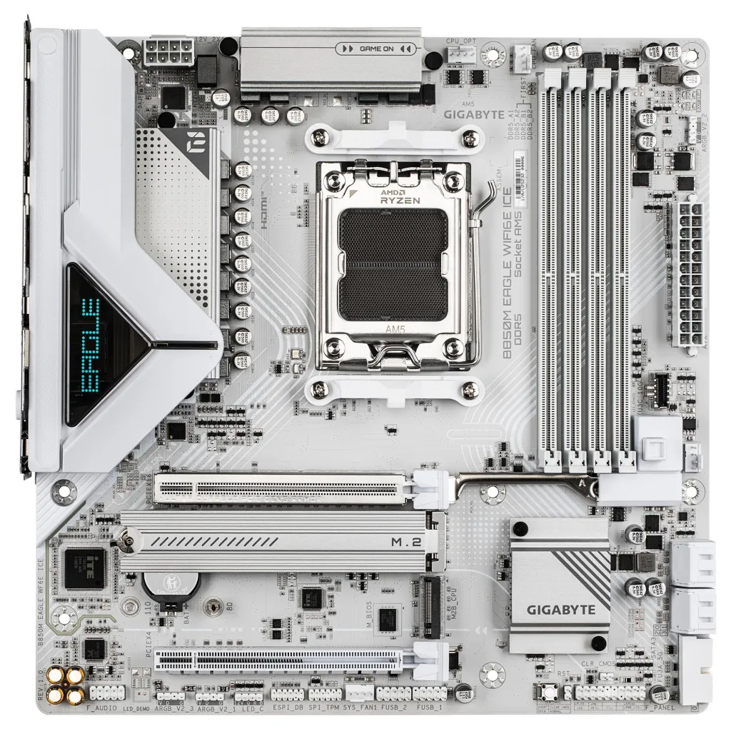 | Summary | GIGABYTE B850M EAGLE WIFI6E ICE Motherboard - AMD Ryzen 9000 Series CPUs, 8+2+2 Phases Digital VRM, up to 8200MHz DDR5 (OC), 1xPCIe 5.0 + 1xPCIe 4.0 M.2, Wi-Fi 6E, 2.5 GbE LAN, USB 3.2 Gen 2. Processor manufacturer: AMD, Processor socket: Socket AM5, Compatible processor series: AMD Ryzen 7000 Series, AMD Ryzen 8000 Series, AMD Ryzen 9000 Series. Supported memory types: DDR5-SDRAM, Maximum internal memory: 256 GB, Memory slots type: DIMM. Supported storage drive interfaces: M.2, PCI Express 4.0, PCI Express 5.0, SATA III, Supported storage drive types: HDD & SSD, RAID levels: 0, 1, 5, 10. Maximum resolution: 4096 x 2160 pixels. Ethernet interface type: 2.5 Gigabit Ethernet, Top Wi-Fi standard: Wi-Fi 6E (802.11ax), Wi-Fi standards: 802.11a, 802.11b, 802.11g, Wi-Fi 4 (802.11n), Wi-Fi 5 (802.11ac), Wi-Fi 6 (802.11ax), Wi-Fi 6E... |
