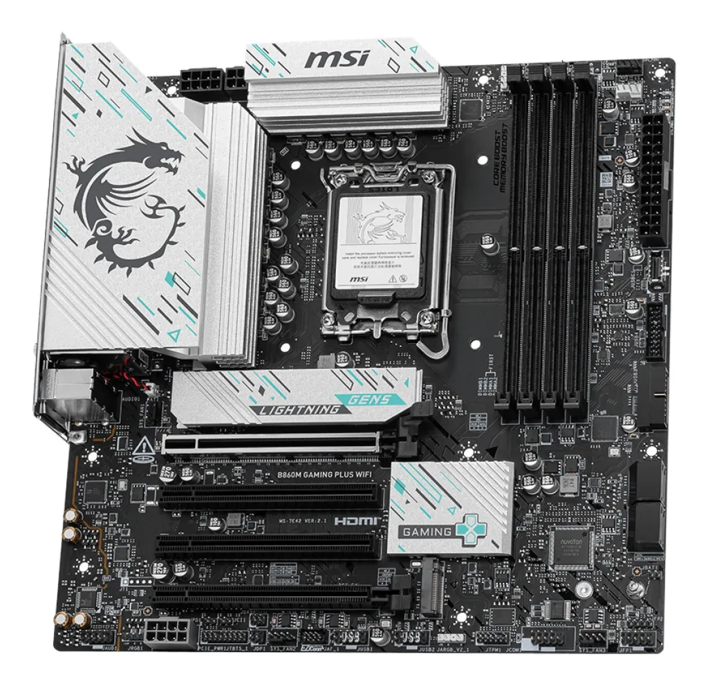The B860M GAMING PLUS WIFI is crafted to offer extensive connectivity, versatile tools, and a premium Wi-Fi solution for gamers seeking a comprehensive experience. Featuring Thunderbolt 4 port, full-speed Wi-Fi 7, 5G LAN, PCIe 5.0 solution, Supplemental PCIe Power and exclusive EZ DIY features, it is ready for 24/7 non-stop gaming optimized for Intel Core Ultra processors.