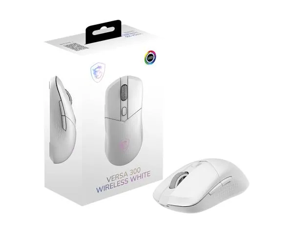 The VERSA 300 WIRELESS WHITE is a lightweight and versatile mouse, ergomomically designed for both gamers and professionals, weighing in at just 60 grams. It offers flexible connectivity options with MSI SWIFTSPEED 2.4 GHz wireless, Bluetooth, and wired for various setups. Featuring a highly accurate optical sensor with up to 8,000 DPI, it ensures precise tracking and responsiveness. Built with micro switches rated for over 30 million clicks and customizable RGB lighting, the VERSA 300 WIRELESS delivers durability, performance, and comfort.