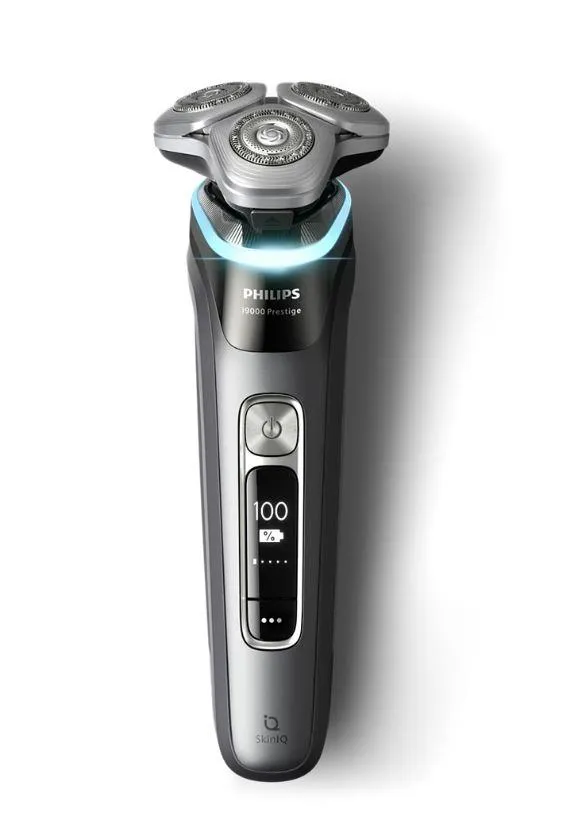 The Philips i9000 Prestige with its triple action Lift&Cut shaving system and compact 360° Precision tilting head cuts hairs at skin level, even in hard-to-reach areas. SkinIQ technology with artificial intelligence senses, guides and adapts to intelligently care for skin comfort.