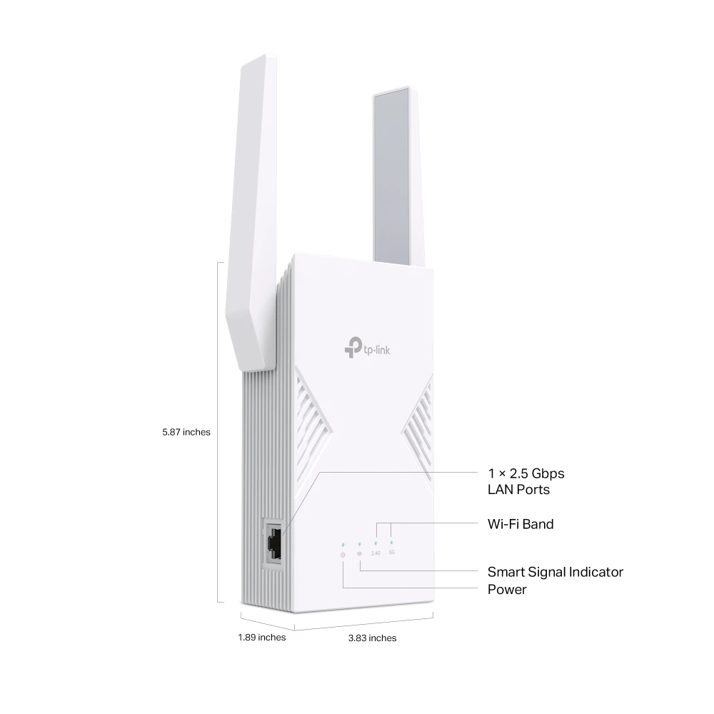 TP-Link BE3600. Tüüp: Võrgusaatja ja -vastuvõtja, Andmeedastuskiirus: 2882 Mbit/s, Ethernet LAN-i andmeedastuskiirused: 2500 Mbit/s. Antenni tüüp: Väline, Saatja võimsus (FCC): 30 dbm. WiFi-standardid: 802.11a, 802.11b, 802.11g, Wi-Fi 4 (802.11n), Wi-Fi 5 (802.11ac), Wi-Fi 6 (802.11ax), Wi-Fi 7..., Wi-Fi laineala: Kaks sagedusala (2,4 GHz / 5 GHz), Ribalaius: 0,32 GHz. Toote värv: Valge, Kogus pakis: 1 tk. AC-sisendpinge: 100-240 V, AC-sisendsagedus: 50/60 Hz, Sisendvool: 0.3 A
