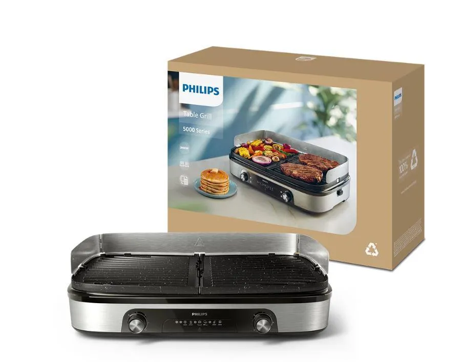 Enjoy the taste of grilled food at home with the Philips table grill. Two heating zones and rotating plates for versatile cooking options and excellent results.