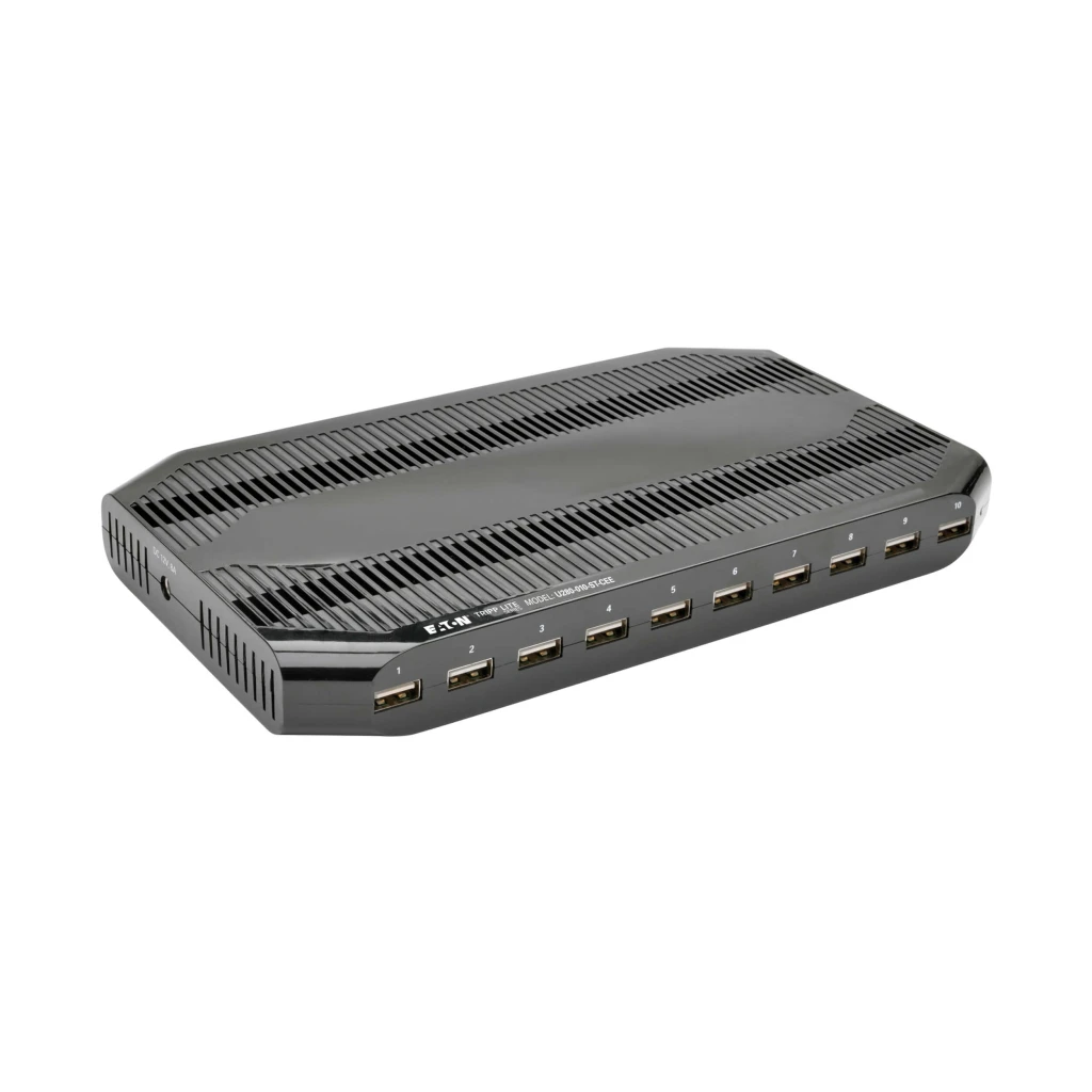 Up to 5V 2.4A per port for charging battery-intensive devices; All ten ports support USB Battery Charging (BC) specification v1.2; External dual-voltage power supply with Schuko plug; Protects against overheating, overcurrent and overcharging; Includes 14 adjustable storage brackets for organizing devices; Charges anywhere AC power is available—no computer required (for 120V applications please use Tripp Lite's P013-Series cables, not included)