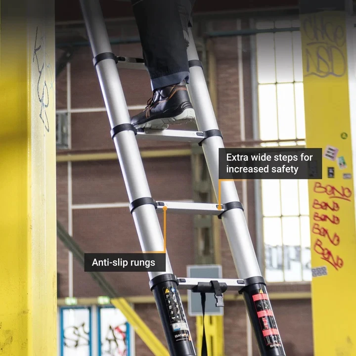 Adjustable height allows for versatile use in professional and home projects; Lightweight yet durable aluminum construction for easy transport and storage; Stabilizer bar increases stability, even on uneven surfaces