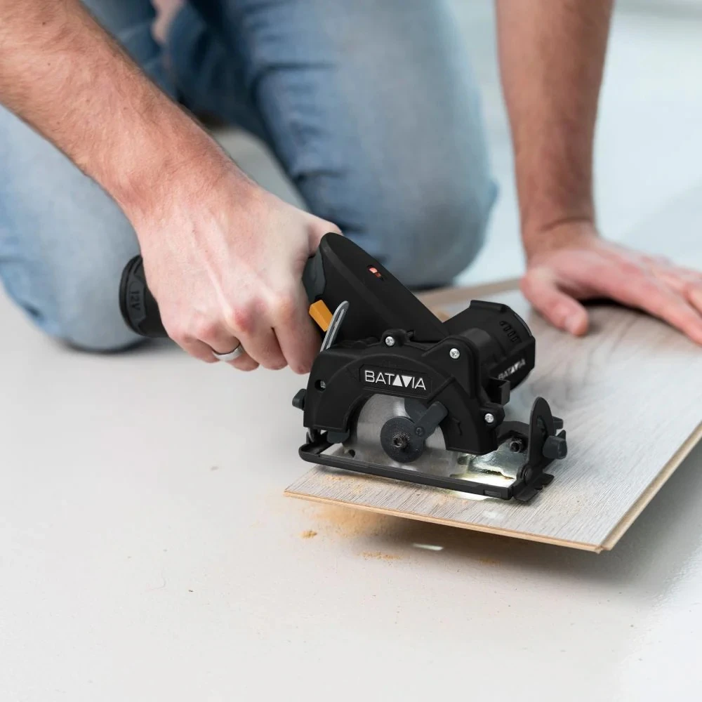 For laminate, OSB, MDF & more - Great for panels, boards, flooring, and repairs; Compact and cordless - Comfortable to handle, even in small work areas; Adjustable cutting depth - Fine-tune depth for different materials and finishes; Mitre cuts up to 45° - Easily handle angled or bevel cuts; Spindle lock – Quick, tool-free blade changes