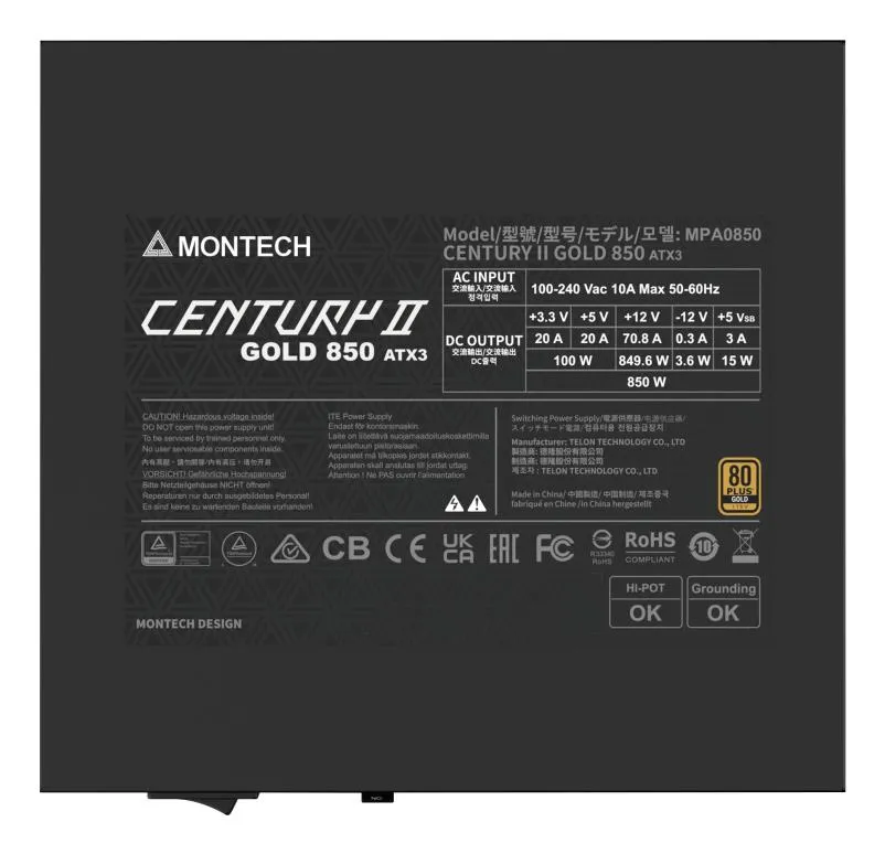 | Summary | Montech CENTURY II. Total power: 850 W, AC input voltage: 100 - 240 V, AC input frequency: 50/60 Hz. Motherboard power connector: 20+4 pin ATX, Motherboard power cable length: 60 cm, SATA power cable length: 950 mm. Purpose: PC, Power supply unit (PSU) form factor: ATX, 80 PLUS certification: 80 PLUS Gold. Product colour: Silver, Black, Cooling type: Active, Fan diameter: 13.5 cm. Compliance certificates: BSMI, CB, CCC, EAC, Electromagnetic Compatibility (EMC), Federal Communications Commission (FCC),... |