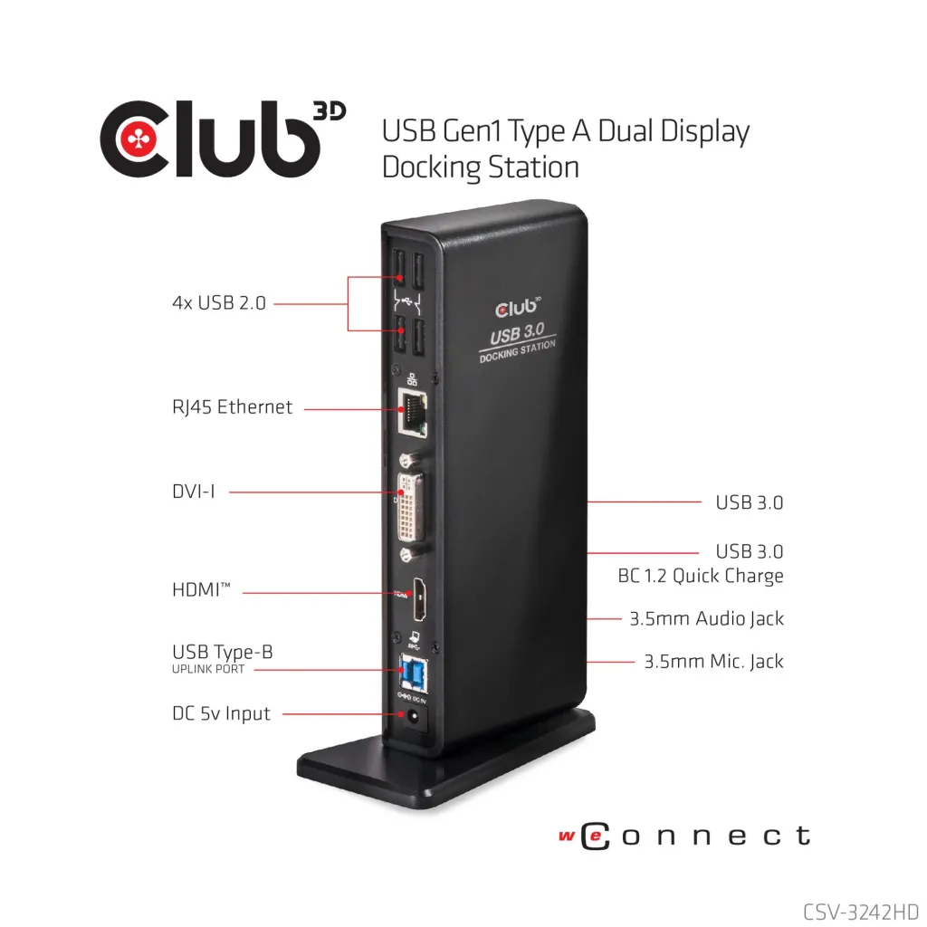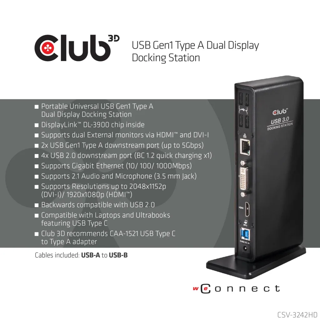 | Summary | CLUB3D USB Gen1 Type A Dual Display ( HDMI and DVI) DisplayLink™ Docking Station. Connectivity technology: Wired, Host interface: USB 3.2 Gen 1 (3.1 Gen 1) Type-A, HDMI version: 1.4a. Ethernet LAN data rates: 10,100,1000 Mbit/s. Product colour: Black, LED indicators: Activity, Operation, Compatibility: Lenovo Dell Acer Asus. MSI. Toshiba Apple HP Razer. Power source type: AC. Windows operating systems supported: Windows 10, Windows 10 Education, Windows 10 Education x64, Windows 10 Enterprise, Windows 10... |
