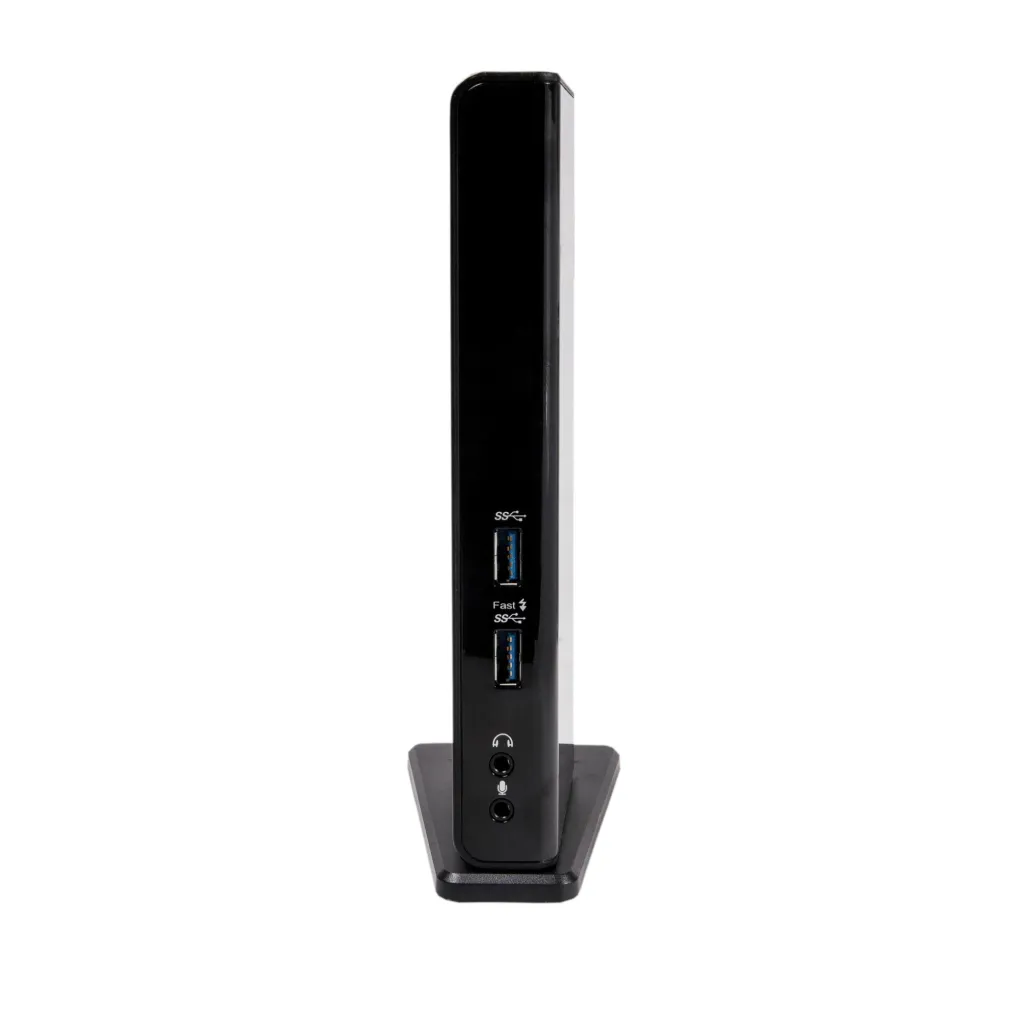 The USB 3.0 dual display docking station is designed for extra connectivity demands. With the docking station, you can extend the connection of a computer to more USB peripherals, Ethernet network, the speaker and the microphone through one single USB cable.
