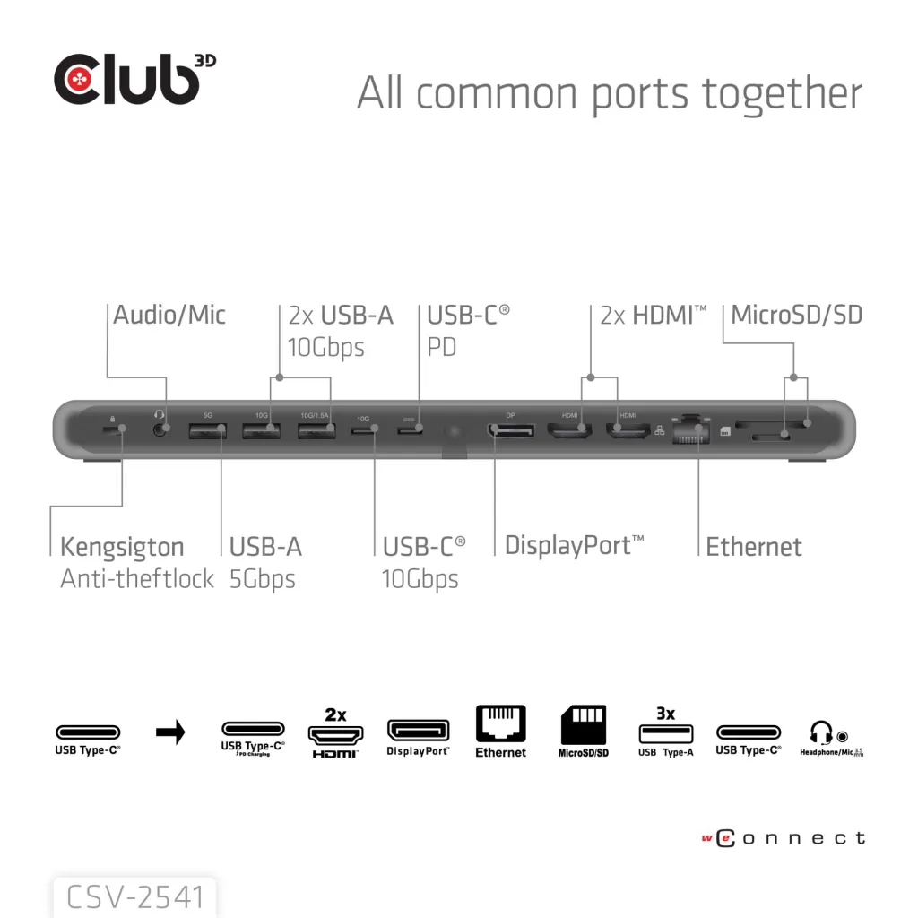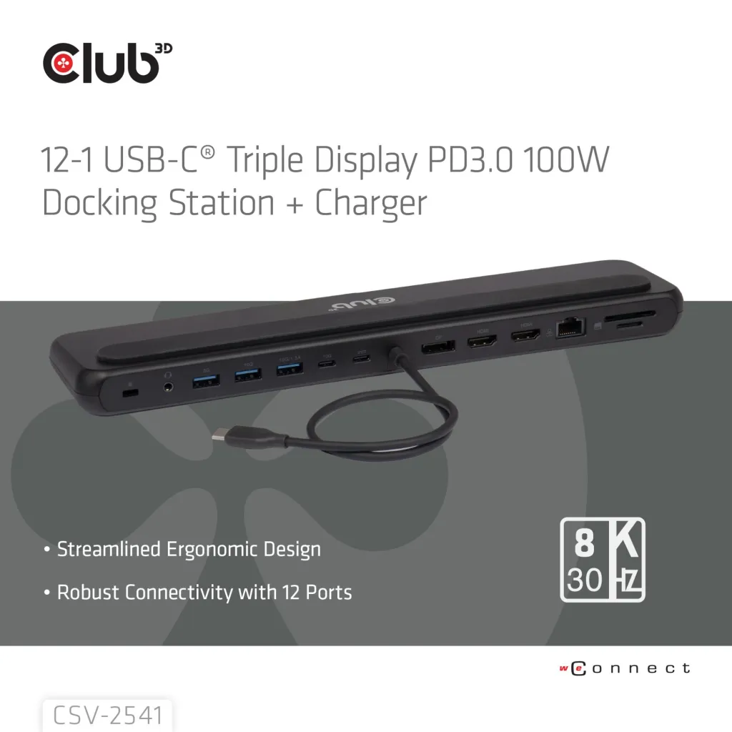 | Summary | CLUB3D CSV-2541. Connectivity technology: Docking, Host interface: USB 3.2 Gen 1 (3.1 Gen 1) Type-C, USB Power Delivery up to: 100 W. Ethernet LAN data rates: 10,100,1000 Mbit/s. Product colour: Black, Compatible memory cards: MicroSD (TransFlash), SD, HD type: 8K Ultra HD. Power source type: USB, Power connector: USB Type-C. Windows operating systems supported: Windows 10, Windows 11 |