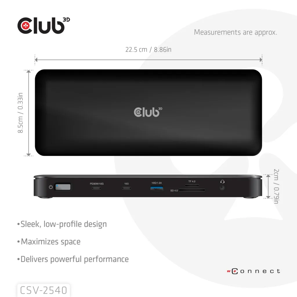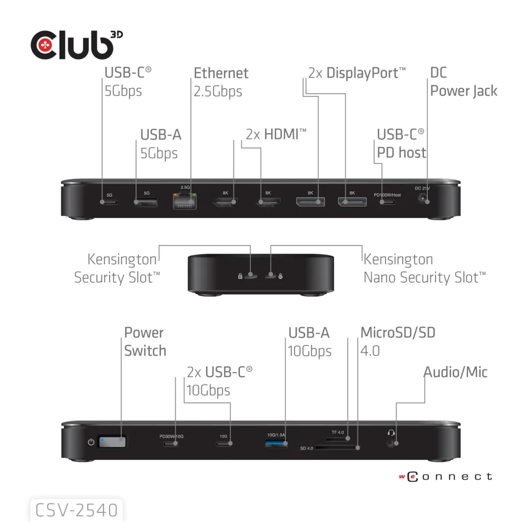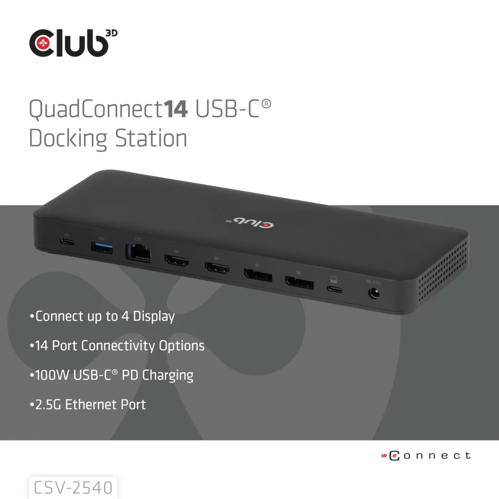| Summary | CLUB3D 14-1 USB-C® Quad Display Docking Station. Connectivity technology: Docking, Host interface: USB 3.2 Gen 1 (3.1 Gen 1) Type-C, USB Power Delivery up to: 100 W. Ethernet LAN data rates: 10,100,1000,2500 Mbit/s. Product colour: Black, Compatible memory cards: MicroSD (TransFlash), SD, HD type: 8K Ultra HD. Power source type: USB, Power connector: USB Type-C, USB cable length: 1 m. Windows operating systems supported: Windows 10, Windows 11 |