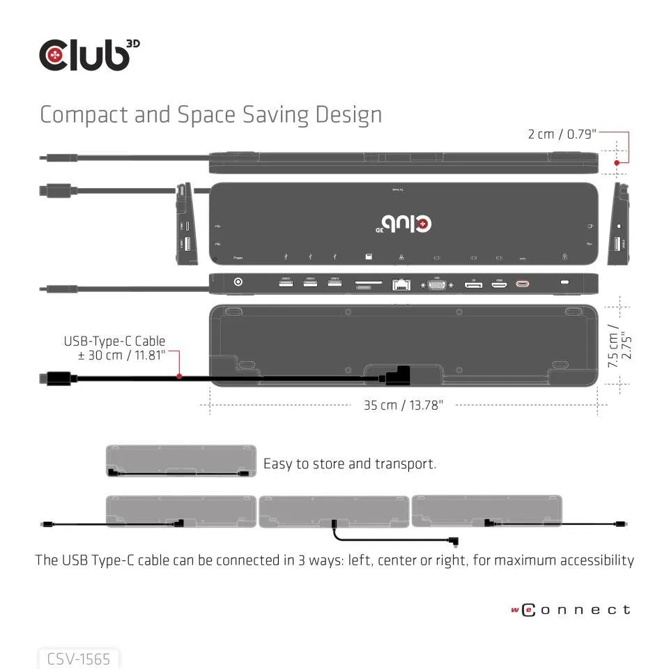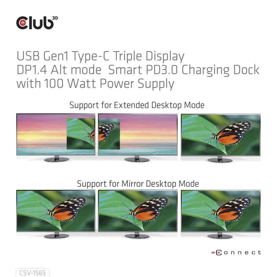 The Club-3D CSV-1565 USB Gen1 Type-C Triple Display DP1.4 Alt mode Smart PD3.0 Charging Dock is an integrated solution combining Video, Data, Power, Ethernet and Audio especially for frequent travellers. The Three different Video ports(HDMI™, DisplayPort™, VGA) allow you to enjoy 3 different images(1x HDMI™ 4K60Hz+1x DP™ 4K60Hz+1x VGA 1920x1080@60Hz) or videos on 3 different displays(1x 4K30Hz+2x1080p@60Hz) outputs under MST mode simultaneously. The USB Type-A ports and USB Type-C data port allow you to connect multiple USB devices to the host. The USB Type-C charging port allows you to provide power for this Dock and can charge the host PC at the same time by connecting a PD3.0 power Adapter, no need to carry your Notebooks PowerSupply. So in general the user is travelling lighter. The Micro SD and SD/MMC ports allow you to read information in the memory card onto the host. The 3.5mm audio port allows enjoying music of the host via a headset. Besides, with the Gigabit Ethernet port, you can enjoy high speed Ethernet on the host. It supports all DP1.4 Alt mode supported hosts. (PC, Laptop, Mobile phone, etc.) Dynamic Current Detection and Power Distribution, the product no longer intercepts the fixed power from the external PD3.0 Power Supply, but intercepts it according to the actual power consumed by itself, so that the PC can be dynamically charged more power. For Video Signal the source device needs to support DisplayPort™1.4 Alt Mode.