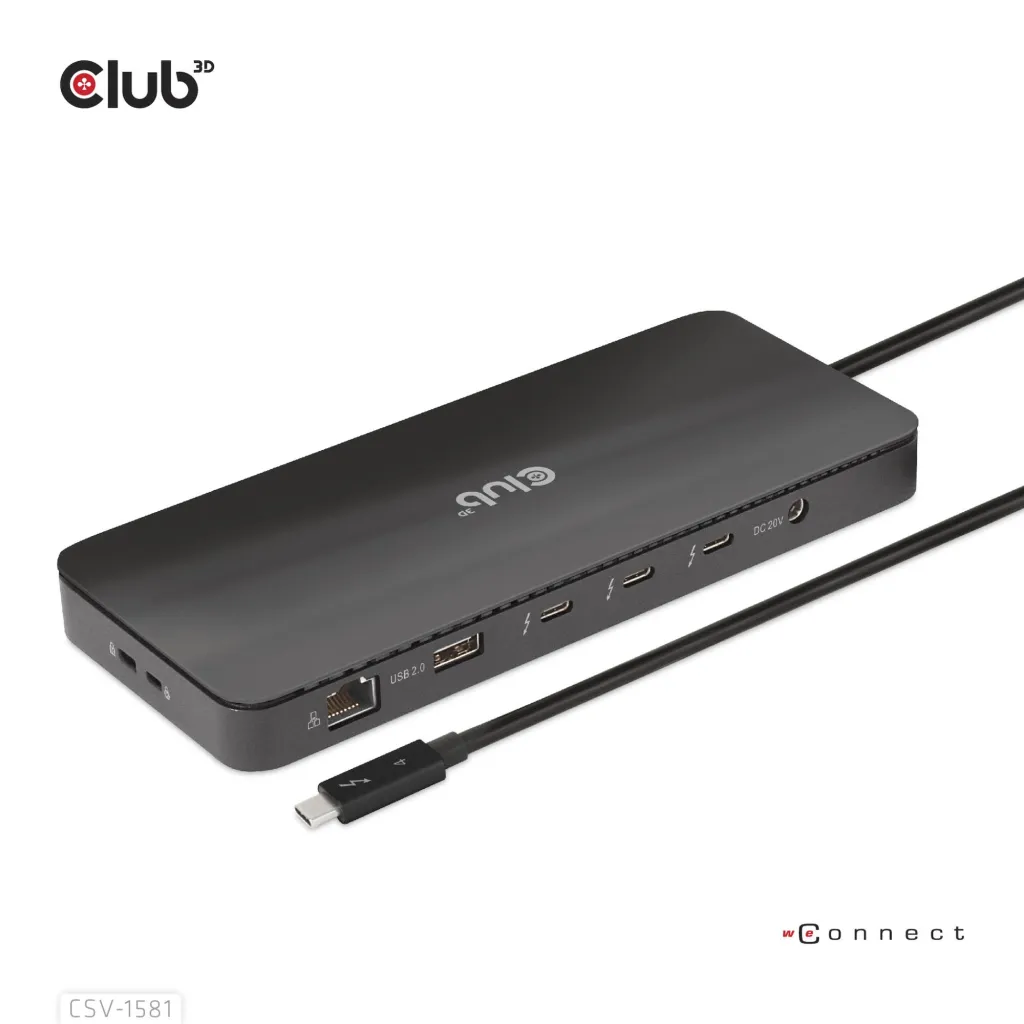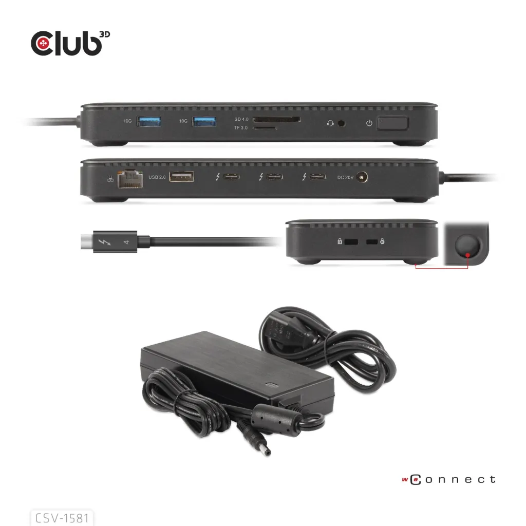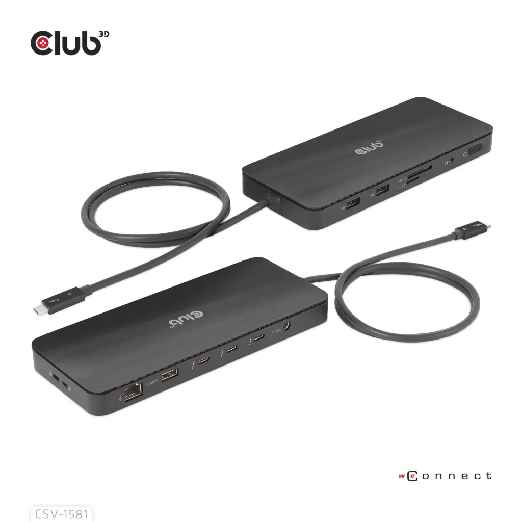The Club 3D CSV-1581 is a Certified Thunderbolt™ 4 11-in-1 Docking Station which provides the most advanced, efficient, and versatile I/O solution available with up to 40Gb/s for data and video. Allowing you to connect one 8K30Hz or two 4K60Hz monitors. The dock supports the smart power function which enables to distribute power according to the power consumption of the connected device, making full use of external power supply. It is designed for Thunderbolt™ 4 based PCs and Thunderbolt™ 3 based Macs utilizing MacOS 11 and later versions(ONLY M1 Pro- and Max Chip).