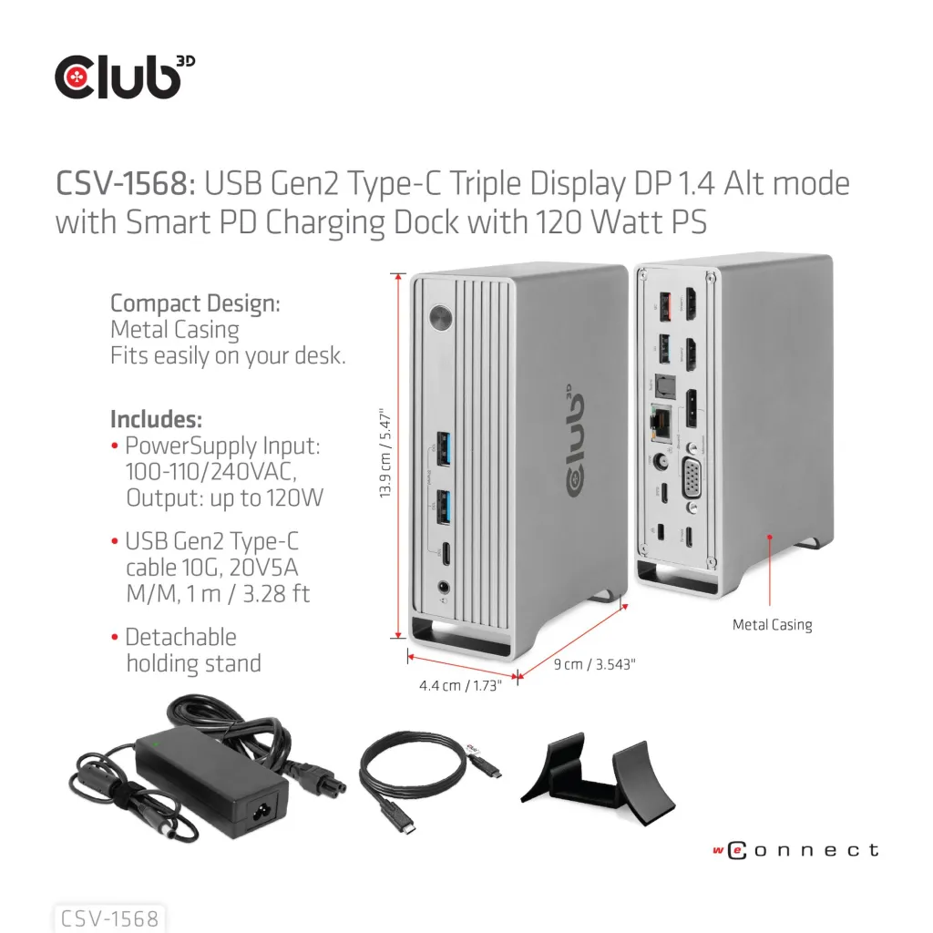 | Tootja koduleht | https://www.club-3d.com/en/detail/2580/usb_gen2_type_c_triple_display_dp_1.4_alt_mode_smart_pd_charging_dock_with_120_watt_psu/ |
