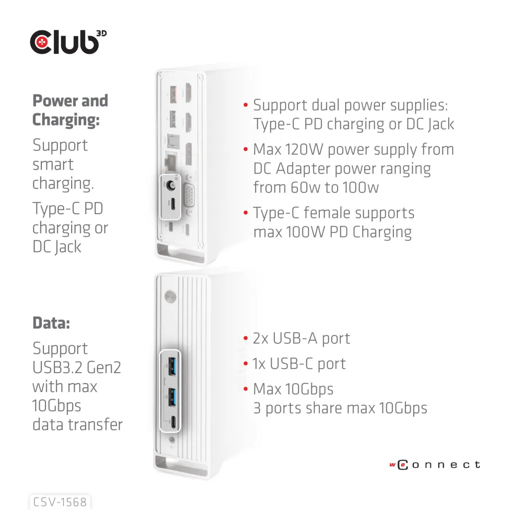 The Club 3D CSV-1568 USB Gen2 Type-C Triple Display DP™ Alt mode + Smart PD Charging Dock with 120 Watt PSU, is an integrated solution combining Video, Data, Power, Ethernet and Audio. It has 4 videos (output 3 videos simultaneously under MST mode) for video transmission, 4 USB data ports (2 USB-A 10G, 1 Type-C 10G, 1 USB-A 5G) for data transmission, 1 USB-A smart charging port for quick charging, 1 Gigabit Ethernet for super fast Ethernet, 2 audio ports (3.5mm audio, Toslink) for enjoying music. Besides, this dock is equipped with dual power jack (Type-C PD Charging or 120W DC power supply).