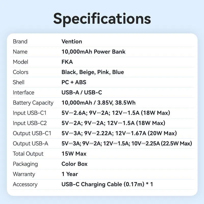 | Summary | Vention FKAB0-C. Battery capacity: 10000 mAh. USB Type-A output ports: 1, USB Type-C ports quantity: 2. Total output power: 22.5 W. Product colour: Black |
