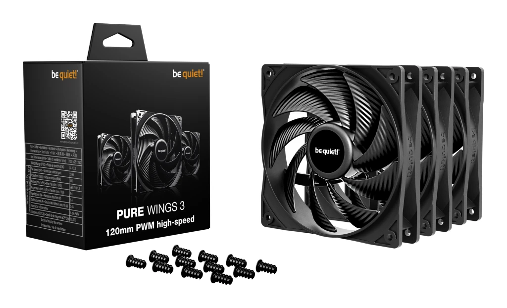 be quiet! Pure Wings 3 120 mm PWM high-speed Triple Pack. Tüüp: Ventilaator, Ventilaatori läbimõõt: 12 cm, Pöörlemiskiirus (max): 2100 RPM, Õhuvool: 101,2 m³/h, Maksimaalne õhusurve: 2,41 mmH2O, Laagri tüüp: Rifle laager. Pinge: 5 - 13.2 V. Toote värv: Must