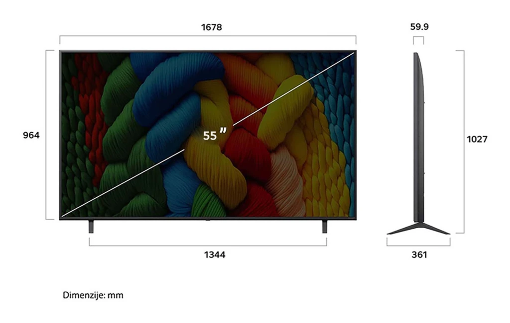 LG NanoCell AI NANO80 55NANO80A3B. Ekraani diagonaal: 139,7 cm (55"), Ekraani resolutsioon: 3840 x 2160 pikslit, HD tüüp: 4K Ultra HD, Ekraani tehnoloogia: LED, Ekraani kuju: Lame, LED tagantvalguse tüüp: Direct-LED. Nutiteleri funktsioon. Loomulik kuvasuhe: 16:9. Digitaalsignaali formaadisüsteem: DVB-C, DVB-S, DVB-S2, DVB-T, DVB-T2. WiFi, Ethernet LAN. Toote värv: Must