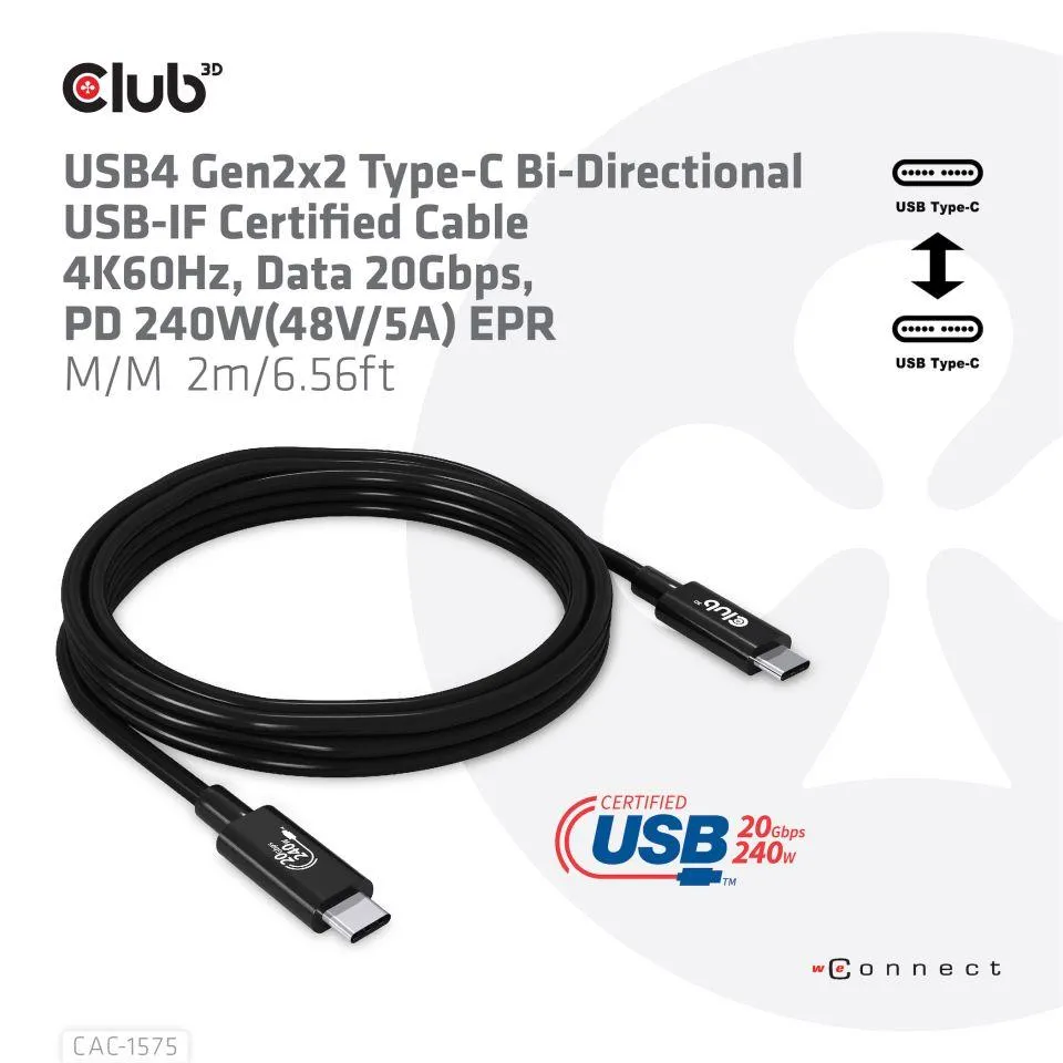 The Club 3D CAC-1575 USB4 Gen2x2 Type-C Bi-Directional USB-IF Certified Cable, Video up to 4K60Hz, Data 20Gbps, PD 240W(48V/5A) EPR, Extended Power Range M/M 2m/6.56ft connects your Notebook, Tablet or Phone with USB4 Type-C output to your favorite existing Peripherals, Accessories and Chargers. It enables Video,Data and Power over a single cable and both ways. This cable supports USB4 Gen2x2 data up to 20Gbps, Video up to 4K60Hz and up to 240Watt(48V/5A) EPR (Extended Power Range) output for Downstream charging or powering your Notebook, Tablet or Smartphone and is USB-IF Certified.