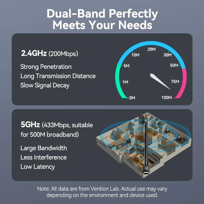 | Summary | Vention USB Wi-Fi Adapter. Connectivity technology: Wired, Host interface: USB, Interface: WLAN. Maximum data transfer rate: 633 Mbit/s, Top Wi-Fi standard: Wi-Fi 5 (802.11ac), Wi-Fi band: Dual-band (2.4 GHz / 5 GHz). Product colour: Black |