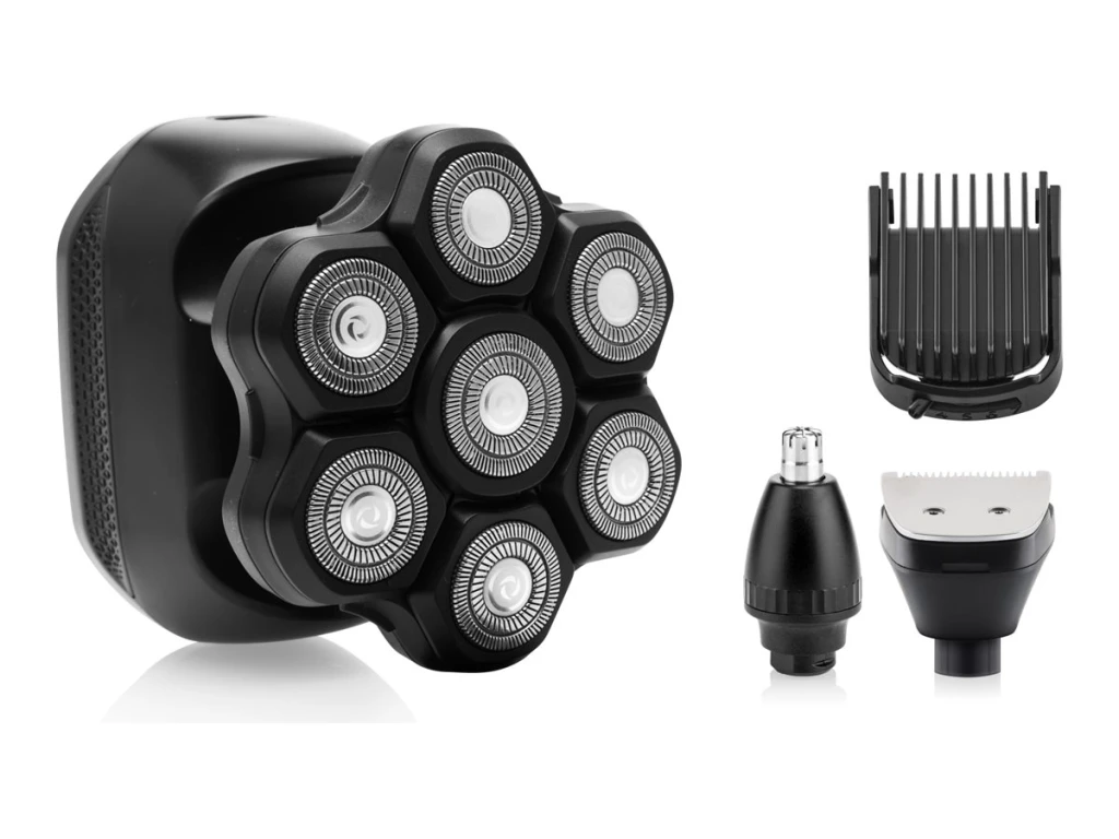Contour-following shaving system; 7 shaving blades for an efficient and fast shave; Milling head with magnetic attachment for easy cleaning; LED display with charge status indicator, operation and charging indication, cleaning reminder, child lock