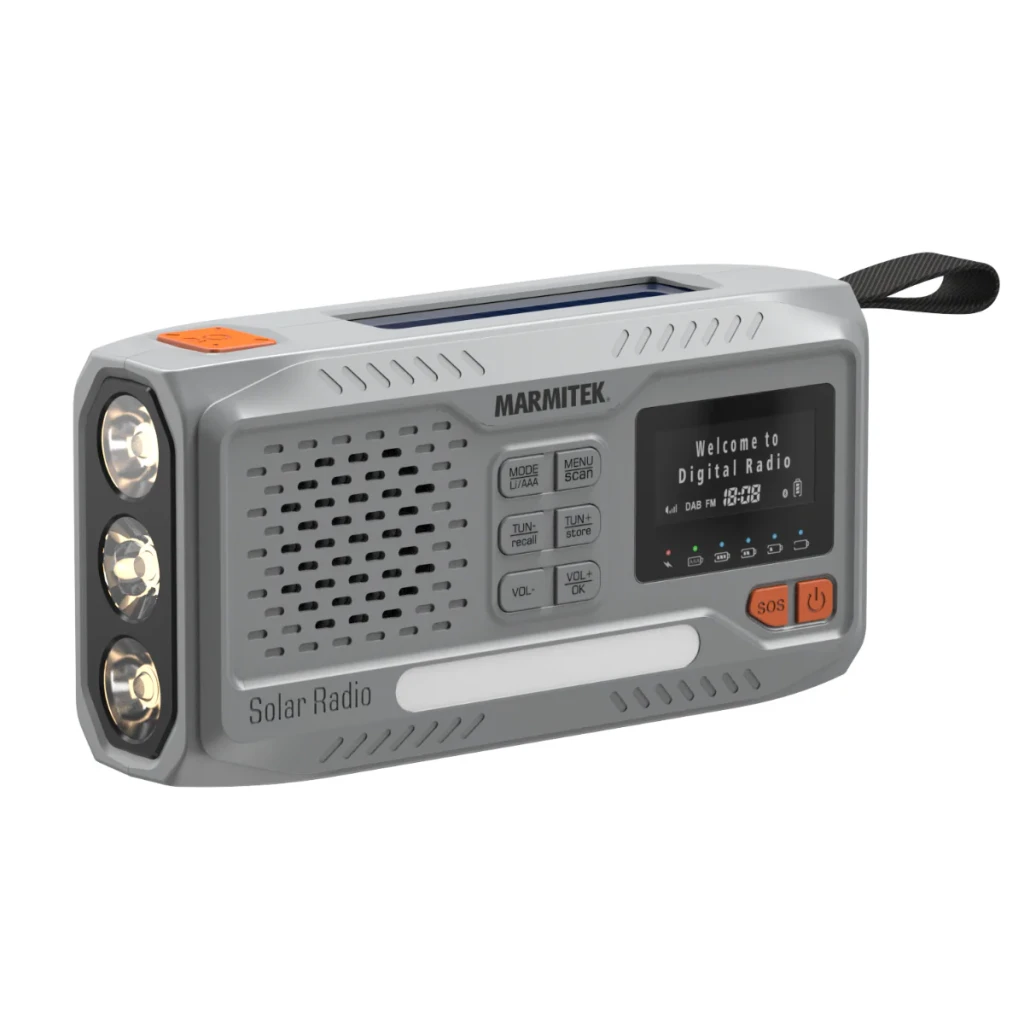 Wind-up radio with DAB+/FM; Bluetooth 5.3 for wireless music streaming; Powerbank function with 4500 mAh battery; Charging via USB-C, solar panel or hand crank; Optional backup with 3x AAA batteries; Dimmable flashlight and reading light