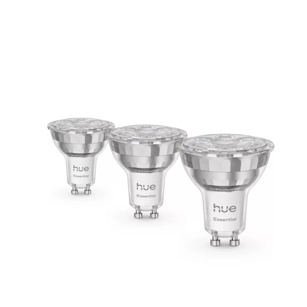 Philips Hue White and colour ambience Essential GU10 – nutikas kohtvalgusti – 345 lm – 4,7 W – 3 tk pakis. Tüüp: Nutipirn, Liides: Bluetooth/Zigbee, Toote värv: Valge. Energiatõhususe klass: F, Võimsustarve (tüüpiline): 4,7 W, Võimsustarve (ooterežiim): 0,5 W. Laius: 50 mm, Kõrgus: 55 mm, Kaal: 150 g. Pakendi tüüp: Karp, Pakendi laius: 144 mm, Pakendi sügavus: 71 mm. Kogus pakis: 3 tk, Komplekti kuuluvate Hue pirnide arv: 3 pirn(id)