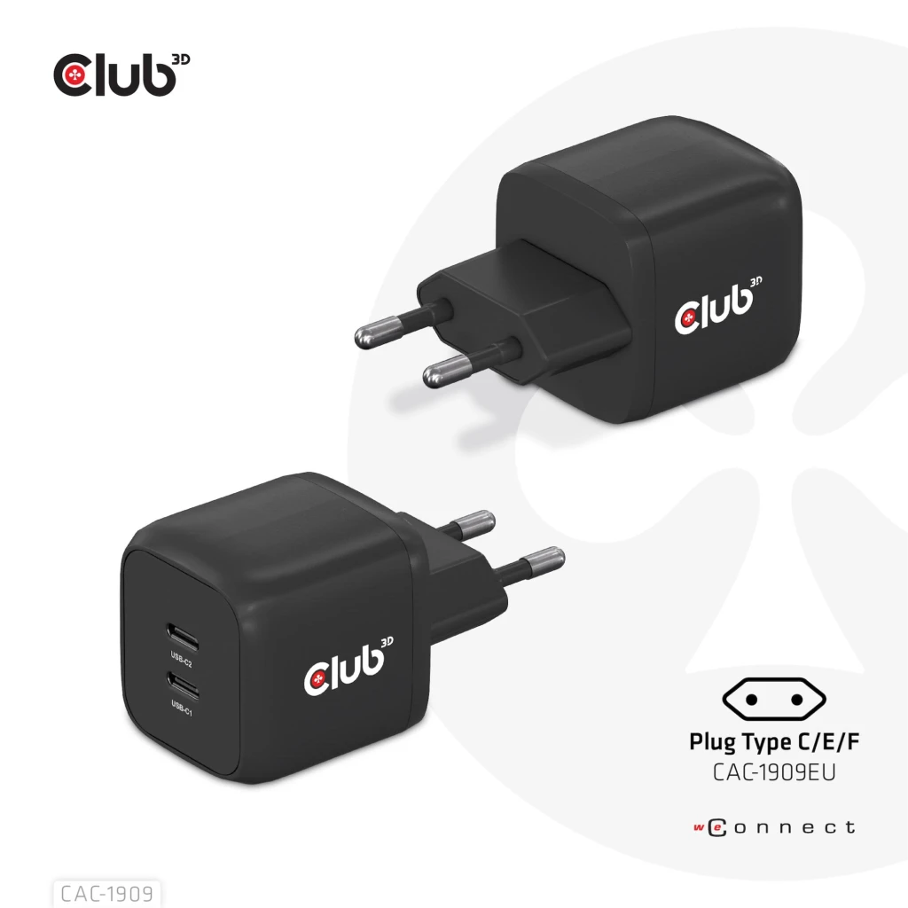 The Club3D CAC-1909 Travel Charger PPS 45W GAN technology, Dual port USB Type-C, Power Delivery(PD) 3.0 Support. Compact size & Superior Performance: GAN technology chipset makes this charger 50% smaller than traditional 45W charger, small enough to carry anywhere. The Programmable Power Supply(PPS) 45W wall charger match a variety of PD devices from smart phones to laptops, one for all making charging simple. This wide compatibility charger will be your convenient companion during your business trip or vacation. The Power Charger is light weight without compromising on Quality and safety. By adopting Power Delivery(PD) charging technology, this versatile Power Charger provides you with charging function through Dual USB Type-C interface, you can charge any connected Mobilephone / Tablet / NoteBook. Furthermore all it needs is a free USB Type-C port on your Dock/NoteBook/Tablet/ Mobile phone to be charged via the bundled USB cable.