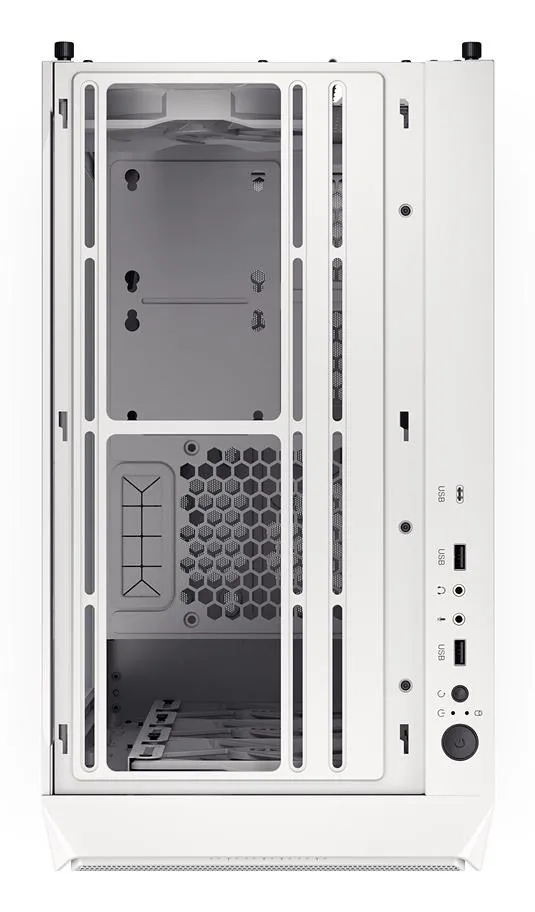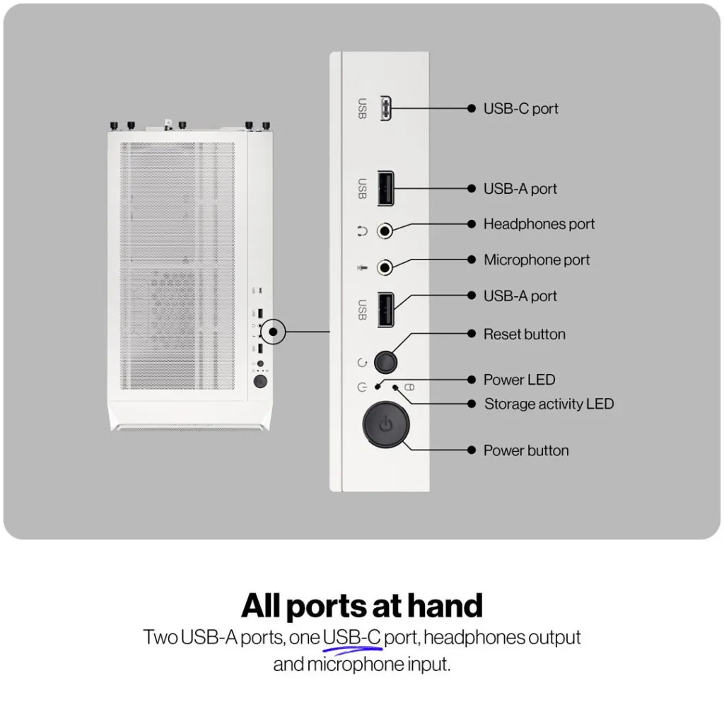 A tempered glass side lets you showcase your build, while thoughtful cable management features enhance both airflow and visual appeal. The front I/O panel provides easy access to three high-speed USB ports — including USB-C — and two audio jacks for maximum convenience.