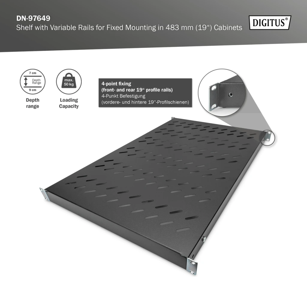 | Tooteseeria | Shelf with Variable Rails for Fixed Mounting in 483 mm (19") Cabinets |