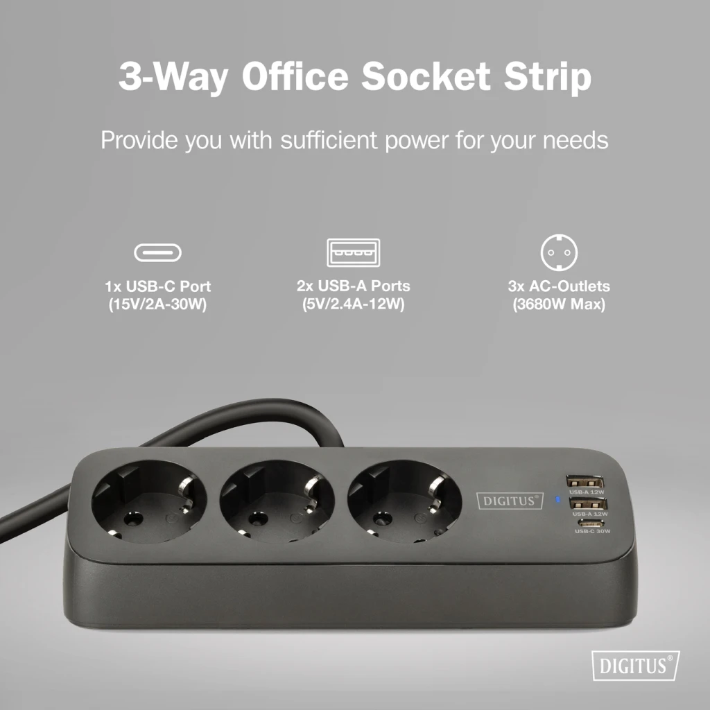 | Tooteseeria | 3-way office socket strip with 2x USB-A and 1x USB-C connections |