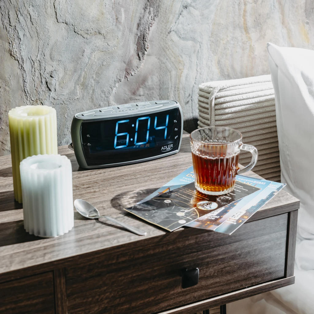 1.8-inch clock radio with red LED; Digit height 48 mm; 24-hour LED display; Double alarm; AM/FM digital radio; 10 preset memory stations