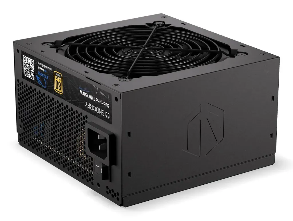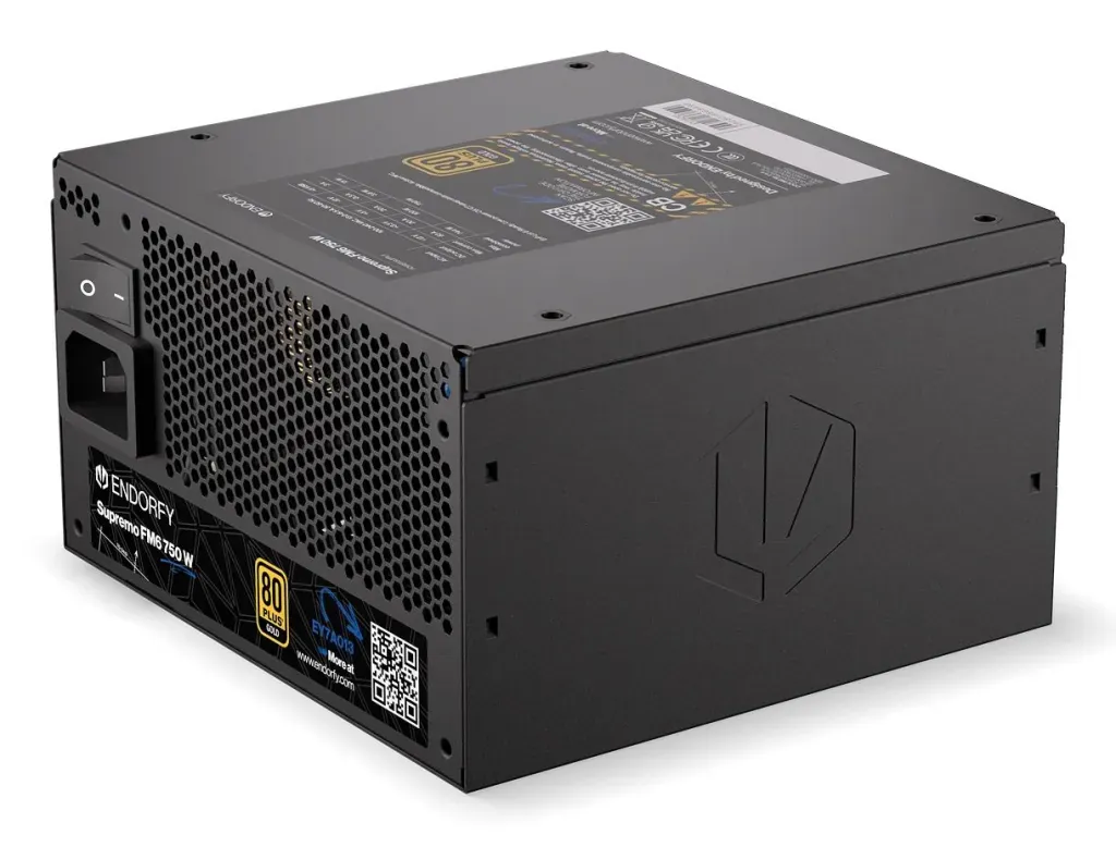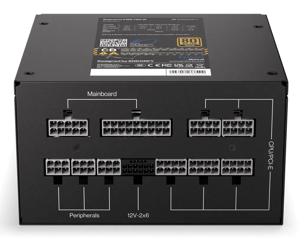 | Summary | ENDORFY Supremo FM6 750 W. Total power: 750 W, AC input voltage: 100 - 240 V, Input current: 13 - 65 A. Motherboard power connector: 24-pin ATX, Motherboard power cable length: 60 cm, SATA power cable length: 560,880,720 mm. Purpose: PC, Power supply unit (PSU) form factor: ATX, 80 PLUS certification: 80 PLUS Gold. Product colour: Black, Cooling type: Active, Fan diameter: 12 cm. Compliance certificates: CE, Federal Communications Commission (FCC), RoHS, UKCA, WEEE |