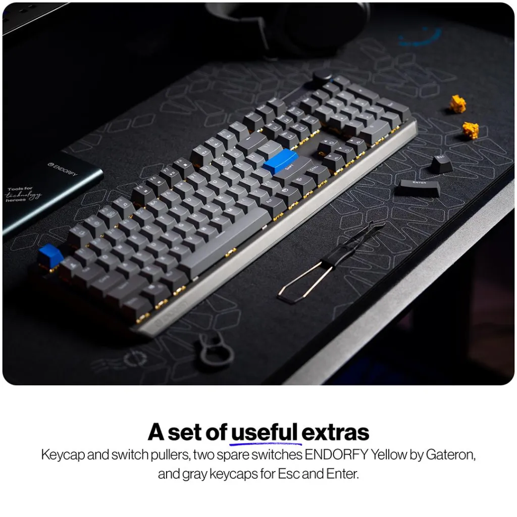 The Thock V2 Wireless comes with a full set of accessories. In the box, along with the keyboard, USB cable, and 2.4 GHz dongle, you’ll find keycap and switch pullers for effortless hot-swapping. We’ve also included two spare ENDORFY Yellow switches and minimalist gray Esc and Enter keycaps for a sleeker, more refined look.