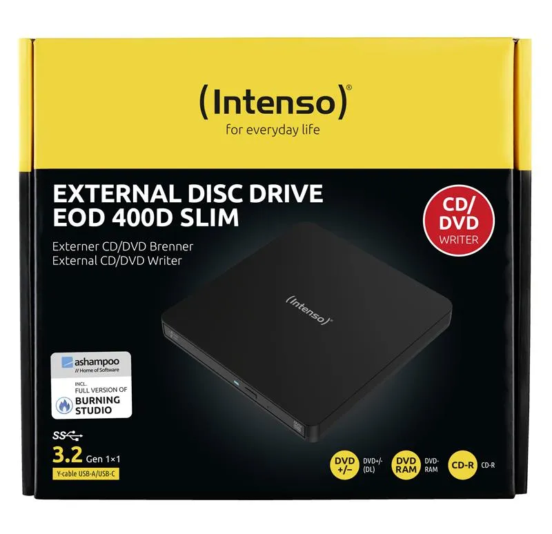 | Summary | Intenso EOD 400D Slim. Product colour: Black, Disc loading type: Front. Purpose: Desktop/Laptop, Optical drive type: DVD Super Multi DL, Interface: USB 3.2 Gen 1 (3.1 Gen 1). CD write speed: 24x, DVD+R write speed: 8x, DVD-R write speed: 8x. Width: 142 mm, Depth: 148 mm, Height: 16 mm. Quantity per pack: 1 pc(s), Bundled software: Ashampoo Burning Studio |