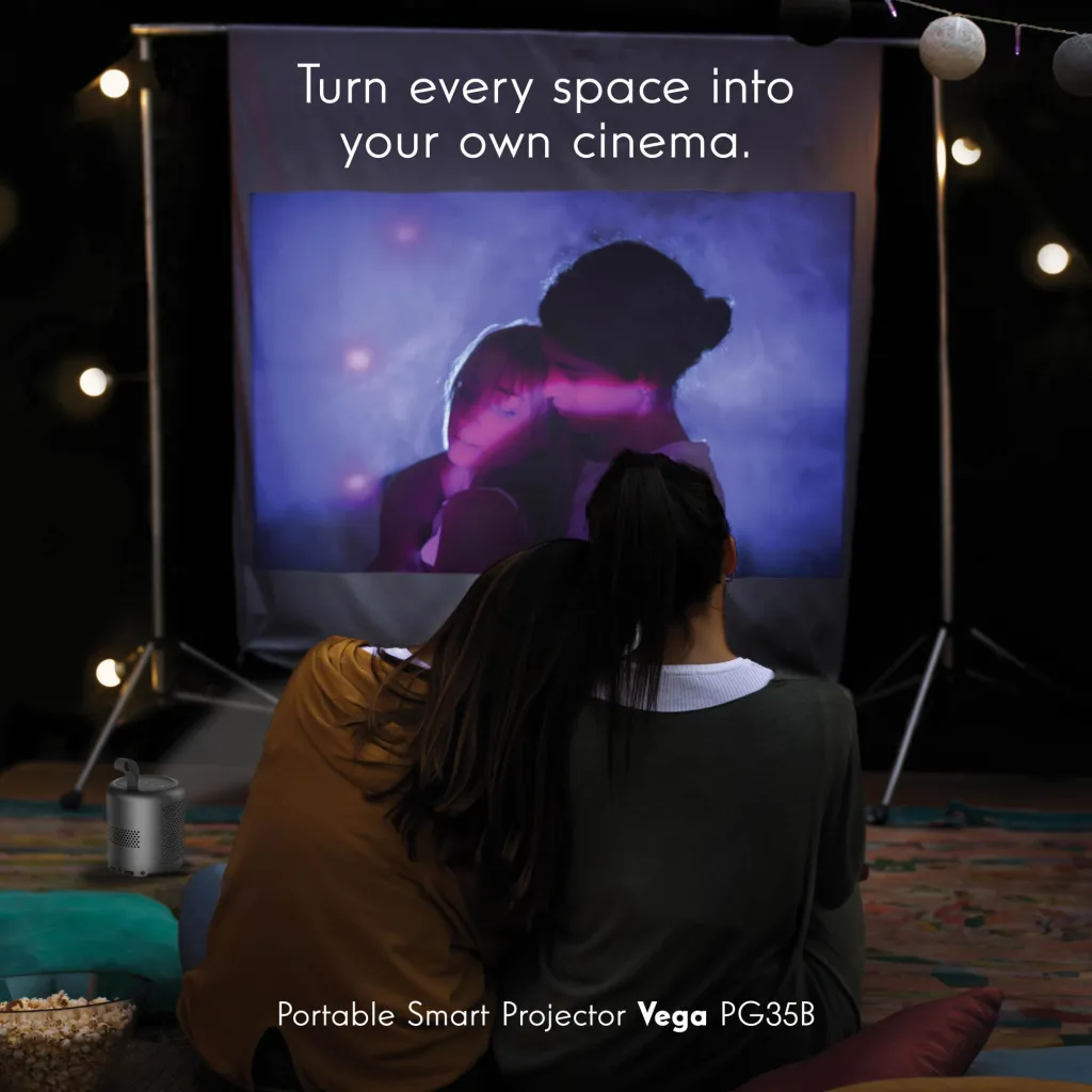 Vega projects stunning visuals up to 100 inches, transforming any wall or surface into a vibrant big screen. Stream your favourite movies, share photos, or play games with crisp, clear picture quality.